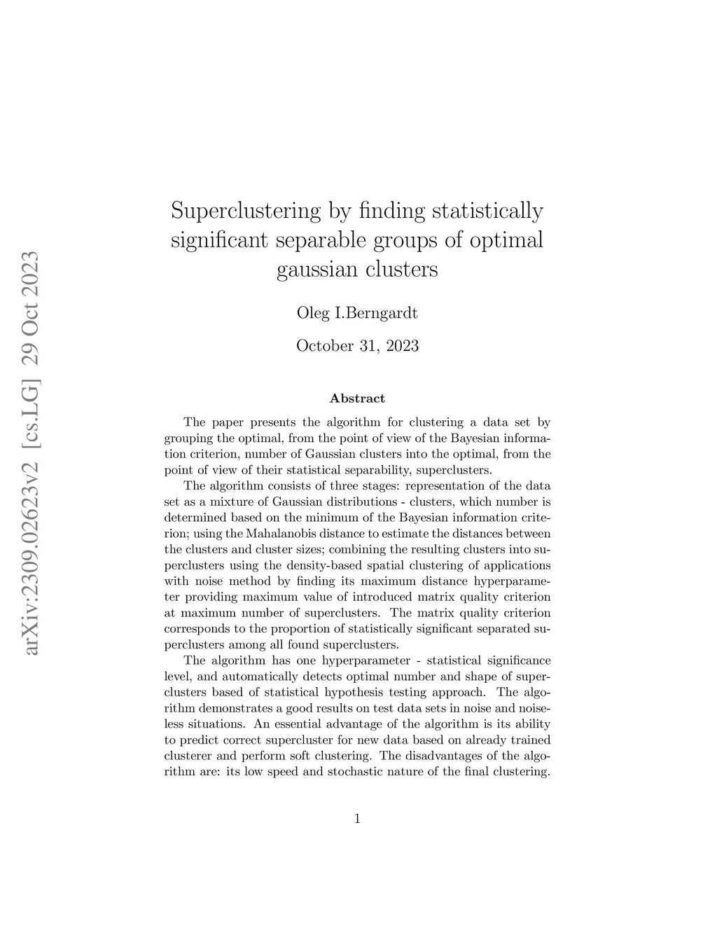 The paper presents the algorithm for clustering a dataset by grouping the optimal, from the point of view of the BIC criterion, number of Gaussian clusters into the optimal, from the point of view of their statistical separability, superclusters. The algorithm consists of three stages: representation of the dataset as a mixture of Gaussian distributions - clusters, which number is determined based on the minimum of the BIC criterion; using the Mahalanobis distance, to estimate the distances between the clusters and cluster sizes; combining the resulting clusters into superclusters using the DBSCAN method by finding its hyperparameter (maximum distance) providing maximum value of introduced matrix quality criterion at maximum number of superclusters. The matrix quality criterion corresponds to the proportion of statistically significant separated superclusters among all found superclusters. The algorithm has only one hyperparameter - statistical significance level, and automatically detects optimal number and shape of superclusters based of statistical hypothesis testing approach. The algorithm demonstrates a good results on test datasets in noise and noiseless situations. An essential advantage of the algorithm is its ability to predict correct supercluster for new data based on already trained clusterer and perform soft (fuzzy) clustering. The disadvantages of the algorithm are: its low speed and stochastic nature of the final clustering. It requires a sufficiently large dataset for clustering, which is typical for many statistical methods.