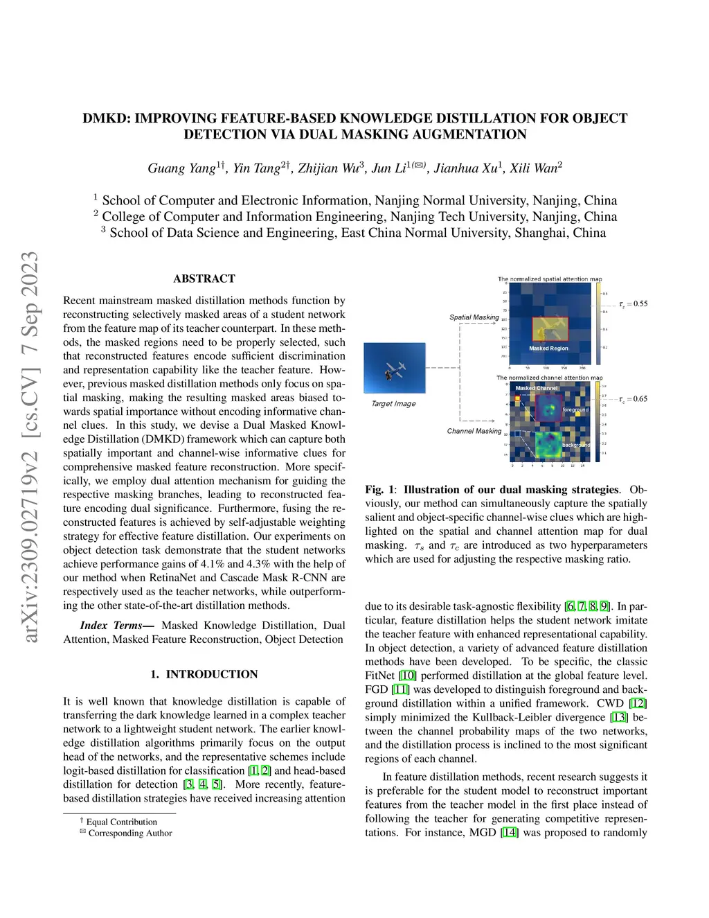 Recent mainstream masked distillation methods function by reconstructing selectively masked areas of a student network from the feature map of its teacher counterpart. In these methods, the masked regions need to be properly selected, such that reconstructed features encode sufficient discrimination and representation capability like the teacher feature. However, previous masked distillation methods only focus on spatial masking, making the resulting masked areas biased towards spatial importance without encoding informative channel clues. In this study, we devise a Dual Masked Knowledge Distillation (DMKD) framework which can capture both spatially important and channel-wise informative clues for comprehensive masked feature reconstruction. More specifically, we employ dual attention mechanism for guiding the respective masking branches, leading to reconstructed feature encoding dual significance. Furthermore, fusing the reconstructed features is achieved by self-adjustable weighting strategy for effective feature distillation. Our experiments on object detection task demonstrate that the student networks achieve performance gains of 4.1% and 4.3% with the help of our method when RetinaNet and Cascade Mask R-CNN are respectively used as the teacher networks, while outperforming the other state-of-the-art distillation methods.