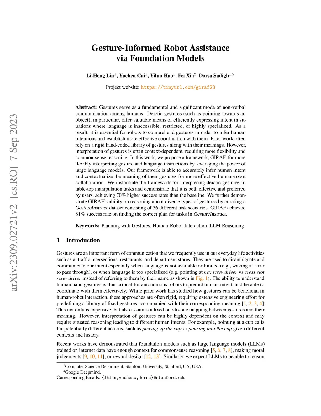 Gestures serve as a fundamental and significant mode of non-verbal communication among humans. Deictic gestures (such as pointing towards an object), in particular, offer valuable means of efficiently expressing intent in situations where language is inaccessible, restricted, or highly specialized. As a result, it is essential for robots to comprehend gestures in order to infer human intentions and establish more effective coordination with them. Prior work often rely on a rigid hand-coded library of gestures along with their meanings. However, interpretation of gestures is often context-dependent, requiring more flexibility and common-sense reasoning. In this work, we propose a framework, GIRAF, for more flexibly interpreting gesture and language instructions by leveraging the power of large language models. Our framework is able to accurately infer human intent and contextualize the meaning of their gestures for more effective human-robot collaboration. We instantiate the framework for interpreting deictic gestures in table-top manipulation tasks and demonstrate that it is both effective and preferred by users, achieving 70% higher success rates than the baseline. We further demonstrate GIRAF's ability on reasoning about diverse types of gestures by curating a GestureInstruct dataset consisting of 36 different task scenarios. GIRAF achieved 81% success rate on finding the correct plan for tasks in GestureInstruct. Website: https://tinyurl.com/giraf23