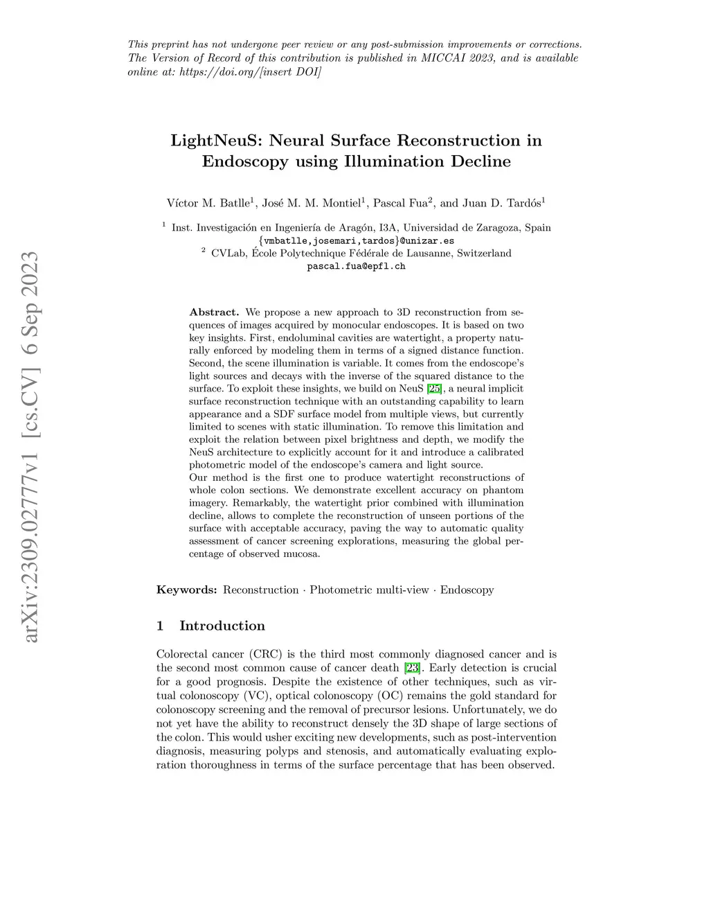 We propose a new approach to 3D reconstruction from sequences of images acquired by monocular endoscopes. It is based on two key insights. First, endoluminal cavities are watertight, a property naturally enforced by modeling them in terms of a signed distance function. Second, the scene illumination is variable. It comes from the endoscope's light sources and decays with the inverse of the squared distance to the surface. To exploit these insights, we build on NeuS, a neural implicit surface reconstruction technique with an outstanding capability to learn appearance and a SDF surface model from multiple views, but currently limited to scenes with static illumination. To remove this limitation and exploit the relation between pixel brightness and depth, we modify the NeuS architecture to explicitly account for it and introduce a calibrated photometric model of the endoscope's camera and light source. Our method is the first one to produce watertight reconstructions of whole colon sections. We demonstrate excellent accuracy on phantom imagery. Remarkably, the watertight prior combined with illumination decline, allows to complete the reconstruction of unseen portions of the surface with acceptable accuracy, paving the way to automatic quality assessment of cancer screening explorations, measuring the global percentage of observed mucosa.