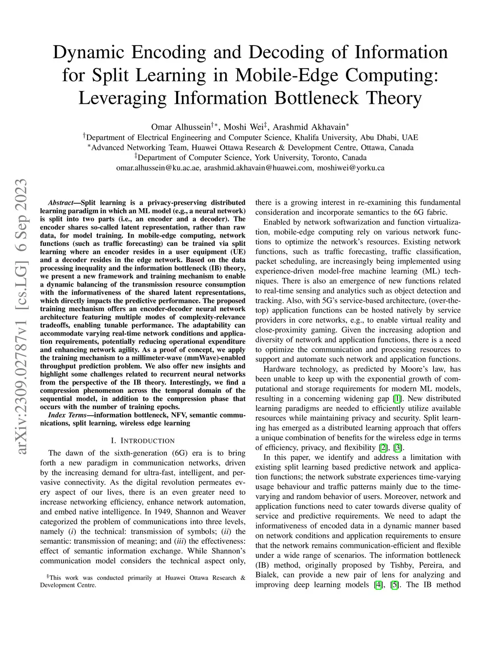 Split learning is a privacy-preserving distributed learning paradigm in which an ML model (e.g., a neural network) is split into two parts (i.e., an encoder and a decoder). The encoder shares so-called latent representation, rather than raw data, for model training. In mobile-edge computing, network functions (such as traffic forecasting) can be trained via split learning where an encoder resides in a user equipment (UE) and a decoder resides in the edge network. Based on the data processing inequality and the information bottleneck (IB) theory, we present a new framework and training mechanism to enable a dynamic balancing of the transmission resource consumption with the informativeness of the shared latent representations, which directly impacts the predictive performance. The proposed training mechanism offers an encoder-decoder neural network architecture featuring multiple modes of complexity-relevance tradeoffs, enabling tunable performance. The adaptability can accommodate varying real-time network conditions and application requirements, potentially reducing operational expenditure and enhancing network agility. As a proof of concept, we apply the training mechanism to a millimeter-wave (mmWave)-enabled throughput prediction problem. We also offer new insights and highlight some challenges related to recurrent neural networks from the perspective of the IB theory. Interestingly, we find a compression phenomenon across the temporal domain of the sequential model, in addition to the compression phase that occurs with the number of training epochs.