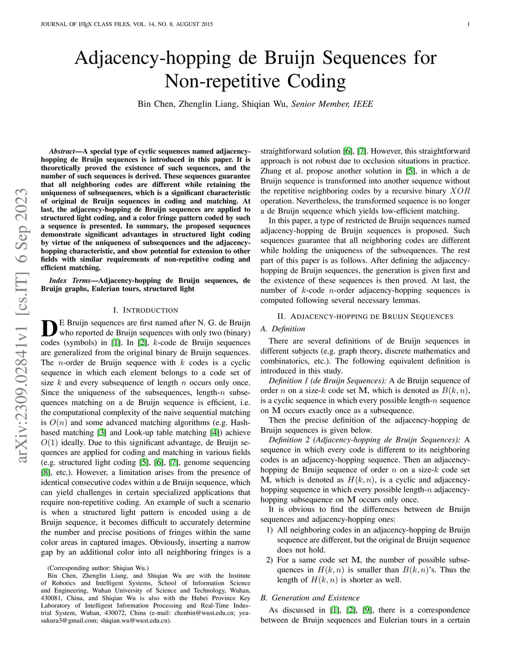 A special type of cyclic sequences named adjacency-hopping de Bruijn sequences is introduced in this paper. It is theoretically proved the existence of such sequences, and the number of such sequences is derived. These sequences guarantee that all neighboring codes are different while retaining the uniqueness of subsequences, which is a significant characteristic of original de Bruijn sequences in coding and matching. At last, the adjacency-hopping de Bruijn sequences are applied to structured light coding, and a color fringe pattern coded by such a sequence is presented. In summary, the proposed sequences demonstrate significant advantages in structured light coding by virtue of the uniqueness of subsequences and the adjacency-hopping characteristic, and show potential for extension to other fields with similar requirements of non-repetitive coding and efficient matching.