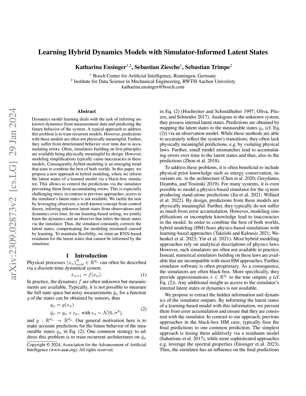 Dynamics model learning deals with the task of inferring unknown dynamics from measurement data and predicting the future behavior of the system. A typical approach to address this problem is to train recurrent models. However, predictions with these models are often not physically meaningful. Further, they suffer from deteriorated behavior over time due to accumulating errors. Often, simulators building on first principles are available being physically meaningful by design. However, modeling simplifications typically cause inaccuracies in these models. Consequently, hybrid modeling is an emerging trend that aims to combine the best of both worlds. In this paper, we propose a new approach to hybrid modeling, where we inform the latent states of a learned model via a black-box simulator. This allows to control the predictions via the simulator preventing them from accumulating errors. This is especially challenging since, in contrast to previous approaches, access to the simulator's latent states is not available. We tackle the task by leveraging observers, a well-known concept from control theory, inferring unknown latent states from observations and dynamics over time. In our learning-based setting, we jointly learn the dynamics and an observer that infers the latent states via the simulator. Thus, the simulator constantly corrects the latent states, compensating for modeling mismatch caused by learning. To maintain flexibility, we train an RNN-based residuum for the latent states that cannot be informed by the simulator.