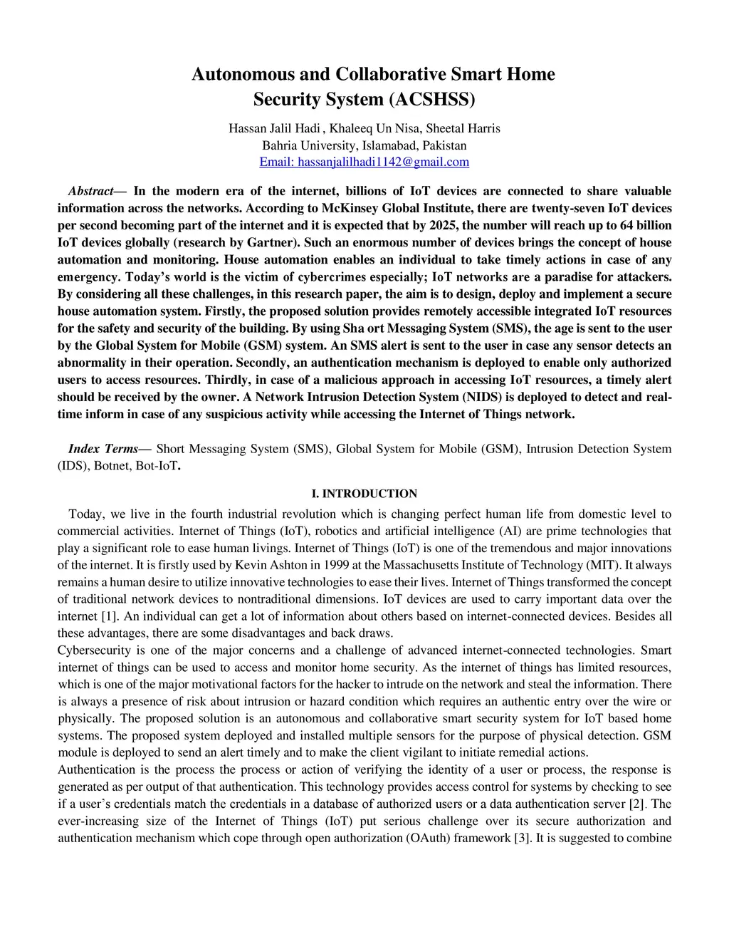 Autonomous and Collaborative Smart Home Security System (ACSHSS)
