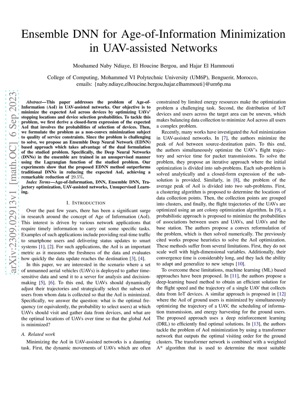 This paper addresses the problem of Age-of-Information (AoI) in UAV-assisted networks. Our objective is to minimize the expected AoI across devices by optimizing UAVs' stopping locations and device selection probabilities. To tackle this problem, we first derive a closed-form expression of the expected AoI that involves the probabilities of selection of devices. Then, we formulate the problem as a non-convex minimization subject to quality of service constraints. Since the problem is challenging to solve, we propose an Ensemble Deep Neural Network (EDNN) based approach which takes advantage of the dual formulation of the studied problem. Specifically, the Deep Neural Networks (DNNs) in the ensemble are trained in an unsupervised manner using the Lagrangian function of the studied problem. Our experiments show that the proposed EDNN method outperforms traditional DNNs in reducing the expected AoI, achieving a remarkable reduction of .