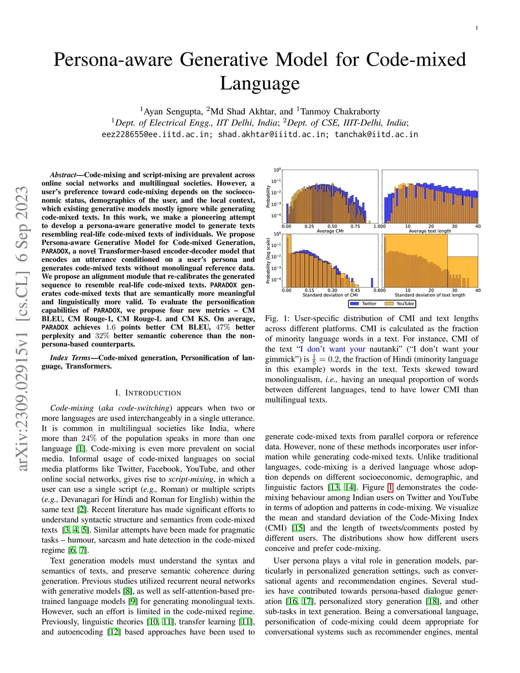 Code-mixing and script-mixing are prevalent across online social networks and multilingual societies. However, a user's preference toward code-mixing depends on the socioeconomic status, demographics of the user, and the local context, which existing generative models mostly ignore while generating code-mixed texts. In this work, we make a pioneering attempt to develop a persona-aware generative model to generate texts resembling real-life code-mixed texts of individuals. We propose a Persona-aware Generative Model for Code-mixed Generation, PARADOX, a novel Transformer-based encoder-decoder model that encodes an utterance conditioned on a user's persona and generates code-mixed texts without monolingual reference data. We propose an alignment module that re-calibrates the generated sequence to resemble real-life code-mixed texts. PARADOX generates code-mixed texts that are semantically more meaningful and linguistically more valid. To evaluate the personification capabilities of PARADOX, we propose four new metrics -- CM BLEU, CM Rouge-1, CM Rouge-L and CM KS. On average, PARADOX achieves 1.6 points better CM BLEU, 47% better perplexity and 32% better semantic coherence than the non-persona-based counterparts.