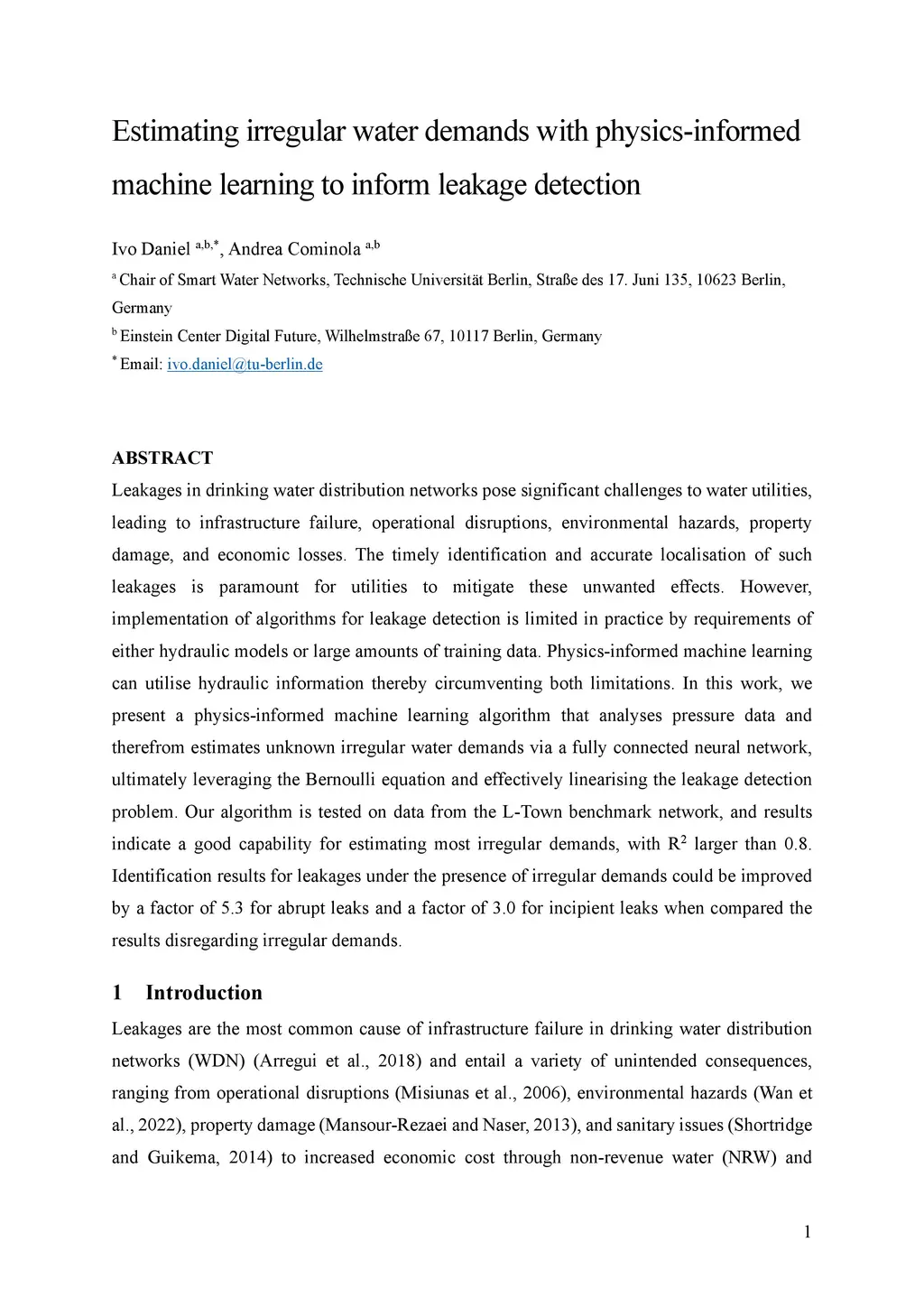 Leakages in drinking water distribution networks pose significant challenges to water utilities, leading to infrastructure failure, operational disruptions, environmental hazards, property damage, and economic losses. The timely identification and accurate localisation of such leakages is paramount for utilities to mitigate these unwanted effects. However, implementation of algorithms for leakage detection is limited in practice by requirements of either hydraulic models or large amounts of training data. Physics-informed machine learning can utilise hydraulic information thereby circumventing both limitations. In this work, we present a physics-informed machine learning algorithm that analyses pressure data and therefrom estimates unknown irregular water demands via a fully connected neural network, ultimately leveraging the Bernoulli equation and effectively linearising the leakage detection problem. Our algorithm is tested on data from the L-Town benchmark network, and results indicate a good capability for estimating most irregular demands, with R2 larger than 0.8. Identification results for leakages under the presence of irregular demands could be improved by a factor of 5.3 for abrupt leaks and a factor of 3.0 for incipient leaks when compared the results disregarding irregular demands.