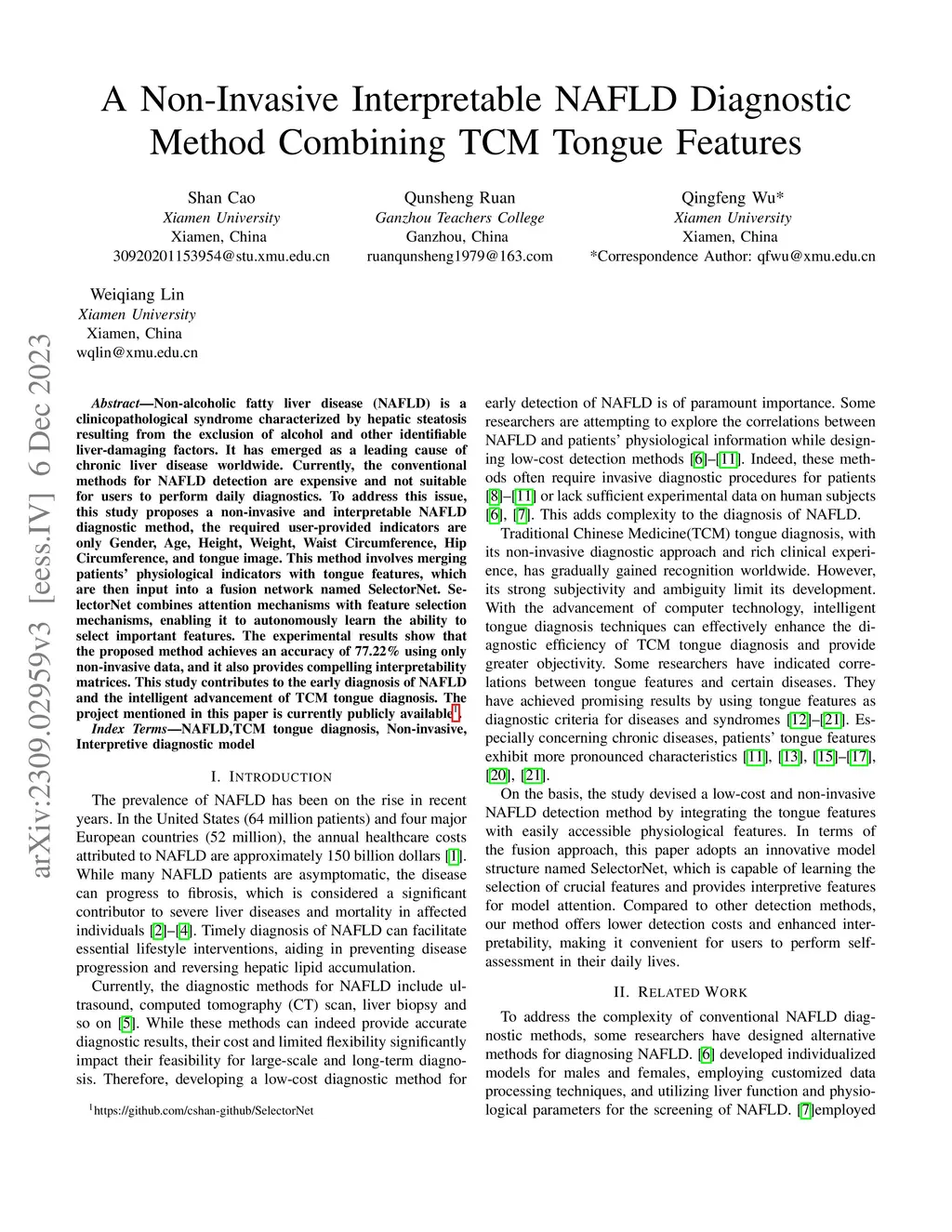 Non-alcoholic fatty liver disease (NAFLD) is a clinicopathological syndrome characterized by hepatic steatosis resulting from the exclusion of alcohol and other identifiable liver-damaging factors. It has emerged as a leading cause of chronic liver disease worldwide. Currently, the conventional methods for NAFLD detection are expensive and not suitable for users to perform daily diagnostics. To address this issue, this study proposes a non-invasive and interpretable NAFLD diagnostic method, the required user-provided indicators are only Gender, Age, Height, Weight, Waist Circumference, Hip Circumference, and tongue image. This method involves merging patients' physiological indicators with tongue features, which are then input into a fusion network named SelectorNet. SelectorNet combines attention mechanisms with feature selection mechanisms, enabling it to autonomously learn the ability to select important features. The experimental results show that the proposed method achieves an accuracy of 77.22\% using only non-invasive data, and it also provides compelling interpretability matrices. This study contributes to the early diagnosis of NAFLD and the intelligent advancement of TCM tongue diagnosis. The project mentioned in this paper is currently publicly available.