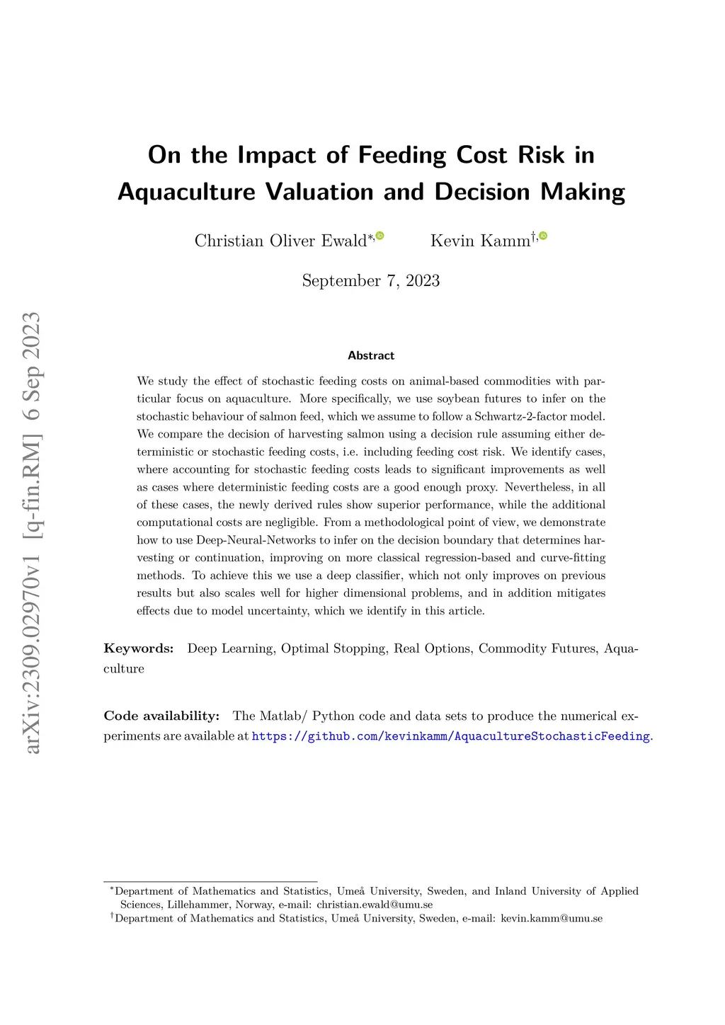 We study the effect of stochastic feeding costs on animal-based commodities with particular focus on aquaculture. More specifically, we use soybean futures to infer on the stochastic behaviour of salmon feed, which we assume to follow a Schwartz-2-factor model. We compare the decision of harvesting salmon using a decision rule assuming either deterministic or stochastic feeding costs, i.e. including feeding cost risk. We identify cases, where accounting for stochastic feeding costs leads to significant improvements as well as cases where deterministic feeding costs are a good enough proxy. Nevertheless, in all of these cases, the newly derived rules show superior performance, while the additional computational costs are negligible. From a methodological point of view, we demonstrate how to use Deep-Neural-Networks to infer on the decision boundary that determines harvesting or continuation, improving on more classical regression-based and curve-fitting methods. To achieve this we use a deep classifier, which not only improves on previous results but also scales well for higher dimensional problems, and in addition mitigates effects due to model uncertainty, which we identify in this article. effects due to model uncertainty, which we identify in this article.