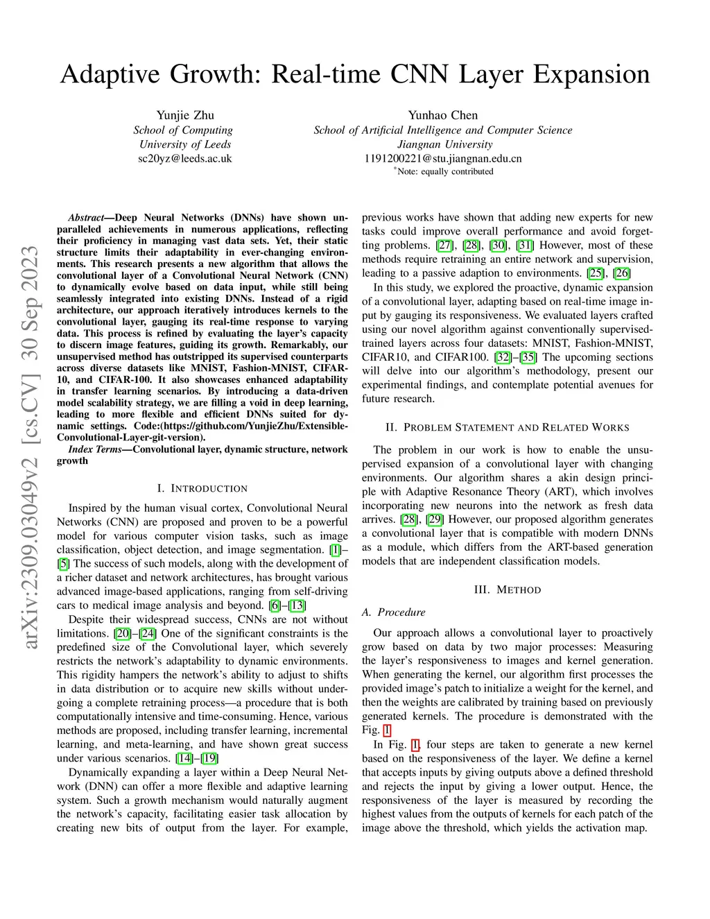 Deep Neural Networks (DNNs) have shown unparalleled achievements in numerous applications, reflecting their proficiency in managing vast data sets. Yet, their static structure limits their adaptability in ever-changing environments. This research presents a new algorithm that allows the convolutional layer of a Convolutional Neural Network (CNN) to dynamically evolve based on data input, while still being seamlessly integrated into existing DNNs. Instead of a rigid architecture, our approach iteratively introduces kernels to the convolutional layer, gauging its real-time response to varying data. This process is refined by evaluating the layer's capacity to discern image features, guiding its growth. Remarkably, our unsupervised method has outstripped its supervised counterparts across diverse datasets like MNIST, Fashion-MNIST, CIFAR-10, and CIFAR-100. It also showcases enhanced adaptability in transfer learning scenarios. By introducing a data-driven model scalability strategy, we are filling a void in deep learning, leading to more flexible and efficient DNNs suited for dynamic settings. Code:(https://github.com/YunjieZhu/Extensible-Convolutional-Layer-git-version).
