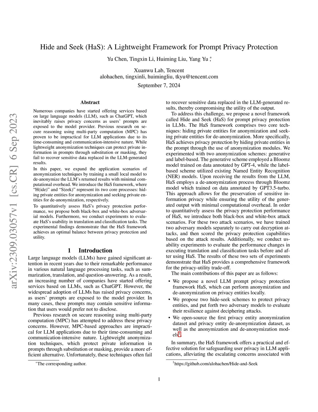 Hide and Seek (HaS): A Lightweight Framework for Prompt Privacy