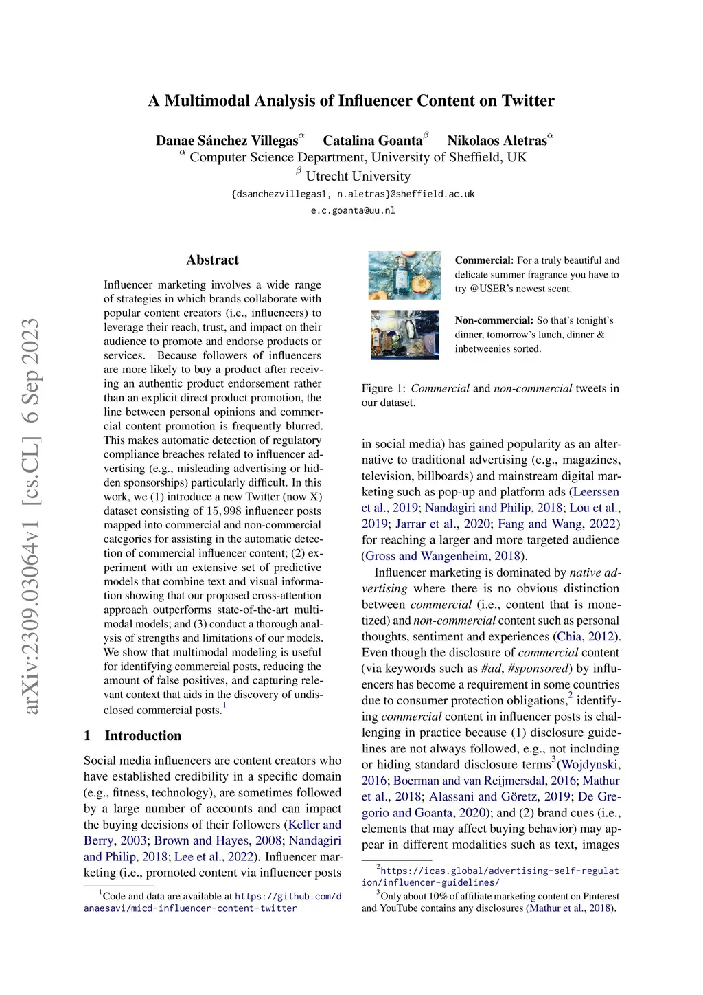 Influencer marketing involves a wide range of strategies in which brands collaborate with popular content creators (i.e., influencers) to leverage their reach, trust, and impact on their audience to promote and endorse products or services. Because followers of influencers are more likely to buy a product after receiving an authentic product endorsement rather than an explicit direct product promotion, the line between personal opinions and commercial content promotion is frequently blurred. This makes automatic detection of regulatory compliance breaches related to influencer advertising (e.g., misleading advertising or hidden sponsorships) particularly difficult. In this work, we (1) introduce a new Twitter (now X) dataset consisting of 15,998 influencer posts mapped into commercial and non-commercial categories for assisting in the automatic detection of commercial influencer content; (2) experiment with an extensive set of predictive models that combine text and visual information showing that our proposed cross-attention approach outperforms state-of-the-art multimodal models; and (3) conduct a thorough analysis of strengths and limitations of our models. We show that multimodal modeling is useful for identifying commercial posts, reducing the amount of false positives, and capturing relevant context that aids in the discovery of undisclosed commercial posts.
