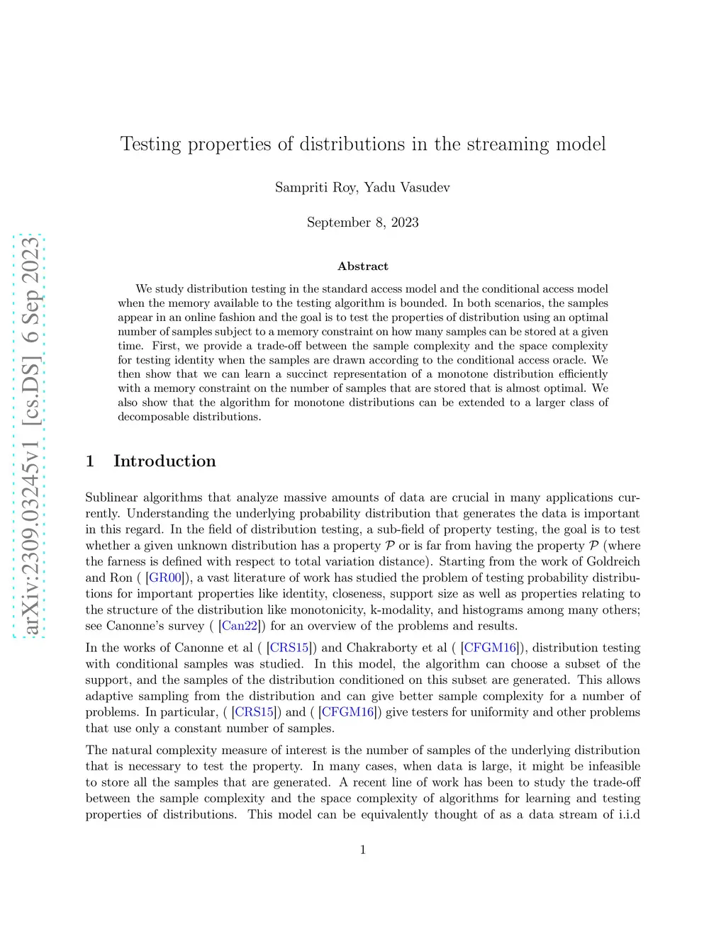 We study distribution testing in the standard access model and the conditional access model when the memory available to the testing algorithm is bounded. In both scenarios, the samples appear in an online fashion and the goal is to test the properties of distribution using an optimal number of samples subject to a memory constraint on how many samples can be stored at a given time. First, we provide a trade-off between the sample complexity and the space complexity for testing identity when the samples are drawn according to the conditional access oracle. We then show that we can learn a succinct representation of a monotone distribution efficiently with a memory constraint on the number of samples that are stored that is almost optimal. We also show that the algorithm for monotone distributions can be extended to a larger class of decomposable distributions.