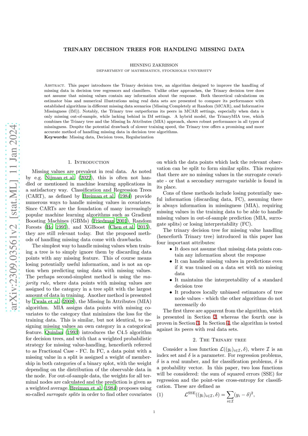 Trinary Decision Trees for handling missing data