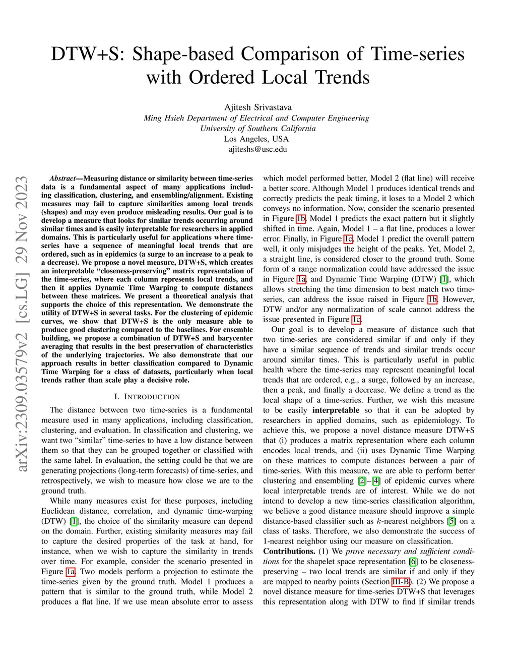 Measuring distance or similarity between time-series data is a fundamental aspect of many applications including classification, clustering, and ensembling/alignment. Existing measures may fail to capture similarities among local trends (shapes) and may even produce misleading results. Our goal is to develop a measure that looks for similar trends occurring around similar times and is easily interpretable for researchers in applied domains. This is particularly useful for applications where time-series have a sequence of meaningful local trends that are ordered, such as in epidemics (a surge to an increase to a peak to a decrease). We propose a novel measure, DTW+S, which creates an interpretable "closeness-preserving" matrix representation of the time-series, where each column represents local trends, and then it applies Dynamic Time Warping to compute distances between these matrices. We present a theoretical analysis that supports the choice of this representation. We demonstrate the utility of DTW+S in several tasks. For the clustering of epidemic curves, we show that DTW+S is the only measure able to produce good clustering compared to the baselines. For ensemble building, we propose a combination of DTW+S and barycenter averaging that results in the best preservation of characteristics of the underlying trajectories. We also demonstrate that our approach results in better classification compared to Dynamic Time Warping for a class of datasets, particularly when local trends rather than scale play a decisive role.