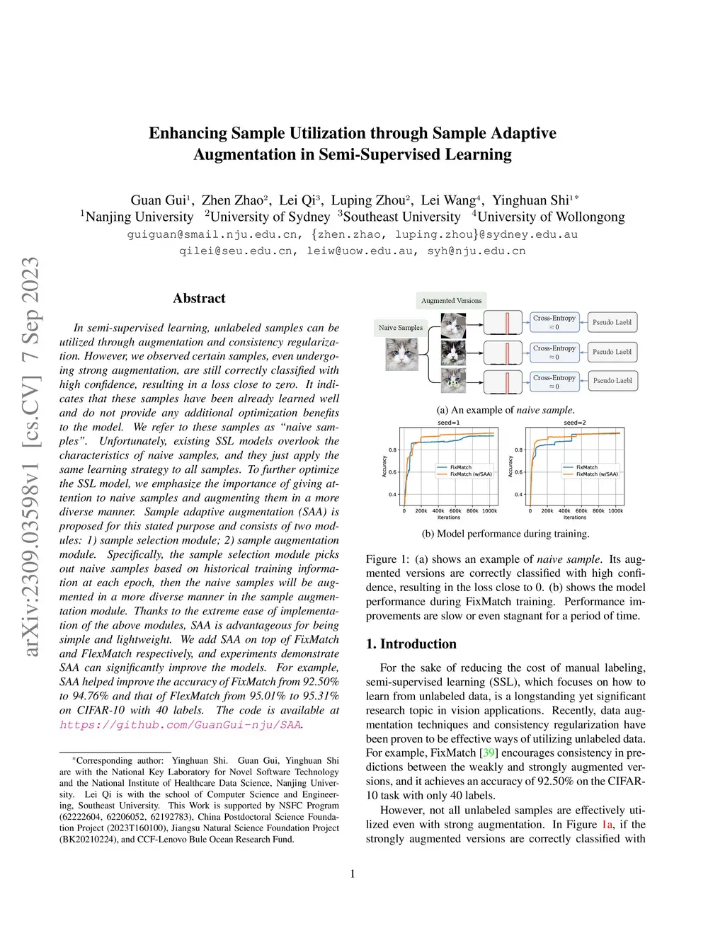 In semi-supervised learning, unlabeled samples can be utilized through augmentation and consistency regularization. However, we observed certain samples, even undergoing strong augmentation, are still correctly classified with high confidence, resulting in a loss close to zero. It indicates that these samples have been already learned well and do not provide any additional optimization benefits to the model. We refer to these samples as ``naive samples". Unfortunately, existing SSL models overlook the characteristics of naive samples, and they just apply the same learning strategy to all samples. To further optimize the SSL model, we emphasize the importance of giving attention to naive samples and augmenting them in a more diverse manner. Sample adaptive augmentation (SAA) is proposed for this stated purpose and consists of two modules: 1) sample selection module; 2) sample augmentation module. Specifically, the sample selection module picks out {naive samples} based on historical training information at each epoch, then the naive samples will be augmented in a more diverse manner in the sample augmentation module. Thanks to the extreme ease of implementation of the above modules, SAA is advantageous for being simple and lightweight. We add SAA on top of FixMatch and FlexMatch respectively, and experiments demonstrate SAA can significantly improve the models. For example, SAA helped improve the accuracy of FixMatch from 92.50% to 94.76% and that of FlexMatch from 95.01% to 95.31% on CIFAR-10 with 40 labels.