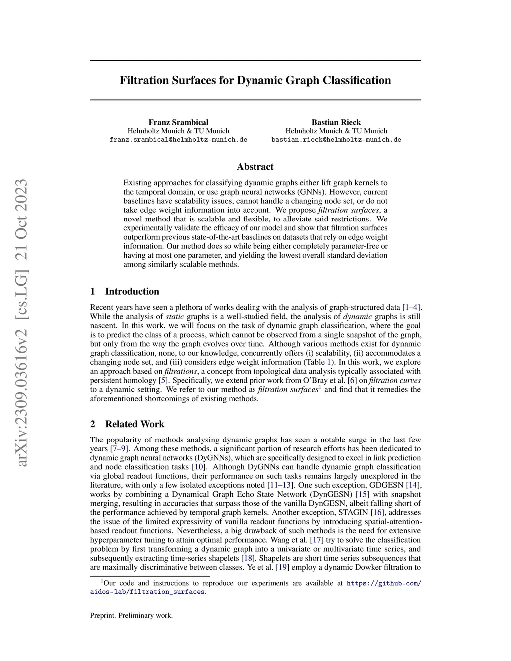 Existing approaches for classifying dynamic graphs either lift graph kernels to the temporal domain, or use graph neural networks (GNNs). However, current baselines have scalability issues, cannot handle a changing node set, or do not take edge weight information into account. We propose filtration surfaces, a novel method that is scalable and flexible, to alleviate said restrictions. We experimentally validate the efficacy of our model and show that filtration surfaces outperform previous state-of-the-art baselines on datasets that rely on edge weight information. Our method does so while being either completely parameter-free or having at most one parameter, and yielding the lowest overall standard deviation among similarly scalable methods.