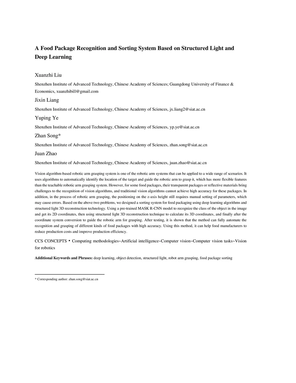 A Food Package Recognition and Sorting System Based on Structured Light