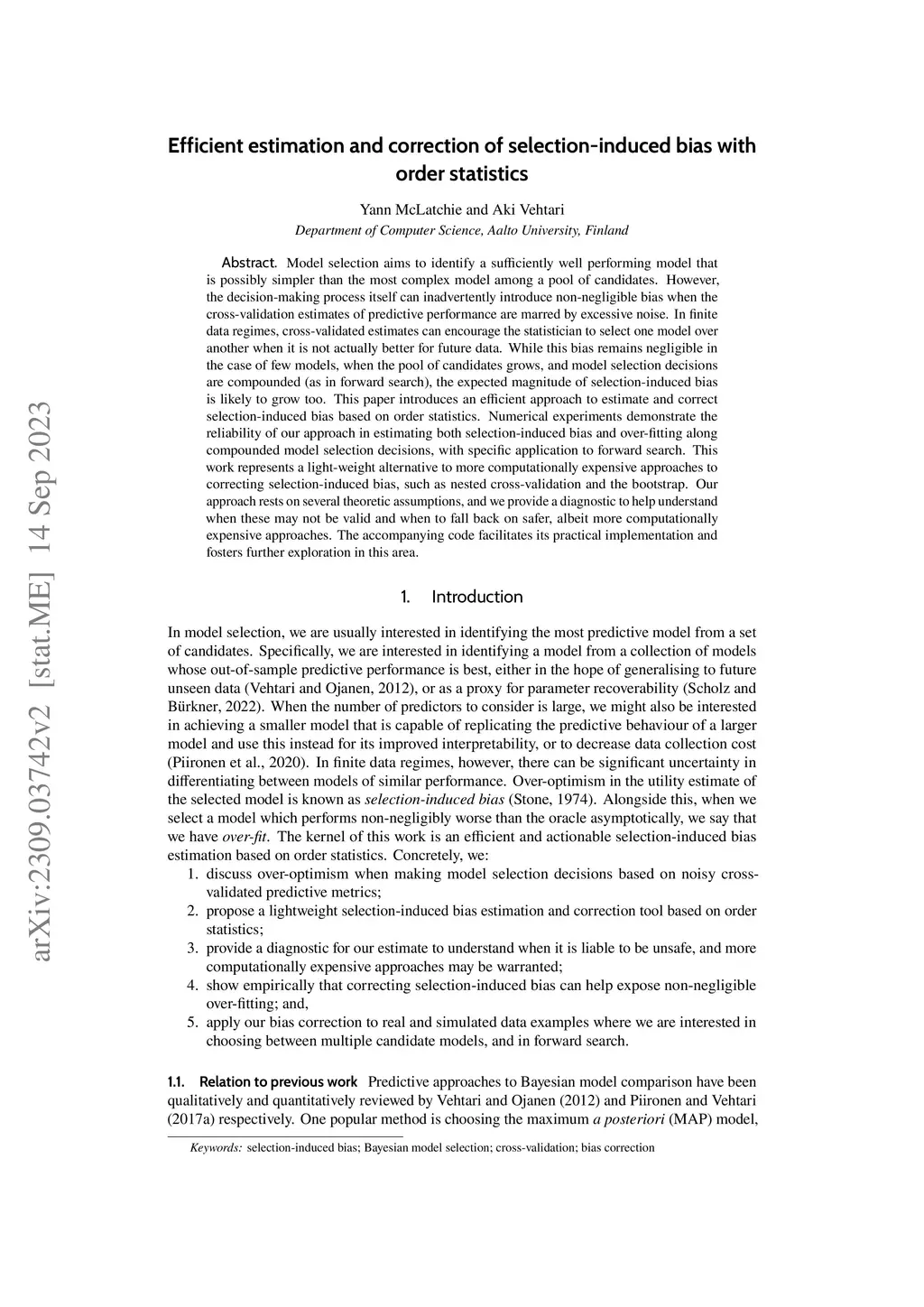 Model selection aims to identify a sufficiently well performing model that is possibly simpler than the most complex model among a pool of candidates. However, the decision-making process itself can inadvertently introduce non-negligible bias when the cross-validation estimates of predictive performance are marred by excessive noise. In finite data regimes, cross-validated estimates can encourage the statistician to select one model over another when it is not actually better for future data. While this bias remains negligible in the case of few models, when the pool of candidates grows, and model selection decisions are compounded (as in forward search), the expected magnitude of selection-induced bias is likely to grow too. This paper introduces an efficient approach to estimate and correct selection-induced bias based on order statistics. Numerical experiments demonstrate the reliability of our approach in estimating both selection-induced bias and over-fitting along compounded model selection decisions, with specific application to forward search. This work represents a light-weight alternative to more computationally expensive approaches to correcting selection-induced bias, such as nested cross-validation and the bootstrap. Our approach rests on several theoretic assumptions, and we provide a diagnostic to help understand when these may not be valid and when to fall back on safer, albeit more computationally expensive approaches. The accompanying code facilitates its practical implementation and fosters further exploration in this area.