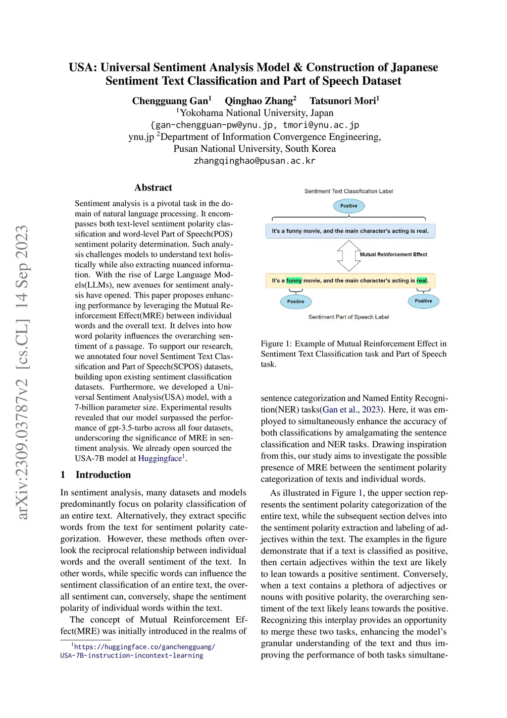 Sentiment analysis is a pivotal task in the domain of natural language processing. It encompasses both text-level sentiment polarity classification and word-level Part of Speech(POS) sentiment polarity determination. Such analysis challenges models to understand text holistically while also extracting nuanced information. With the rise of Large Language Models(LLMs), new avenues for sentiment analysis have opened. This paper proposes enhancing performance by leveraging the Mutual Reinforcement Effect(MRE) between individual words and the overall text. It delves into how word polarity influences the overarching sentiment of a passage. To support our research, we annotated four novel Sentiment Text Classification and Part of Speech(SCPOS) datasets, building upon existing sentiment classification datasets. Furthermore, we developed a Universal Sentiment Analysis(USA) model, with a 7-billion parameter size. Experimental results revealed that our model surpassed the performance of gpt-3.5-turbo across all four datasets, underscoring the significance of MRE in sentiment analysis.