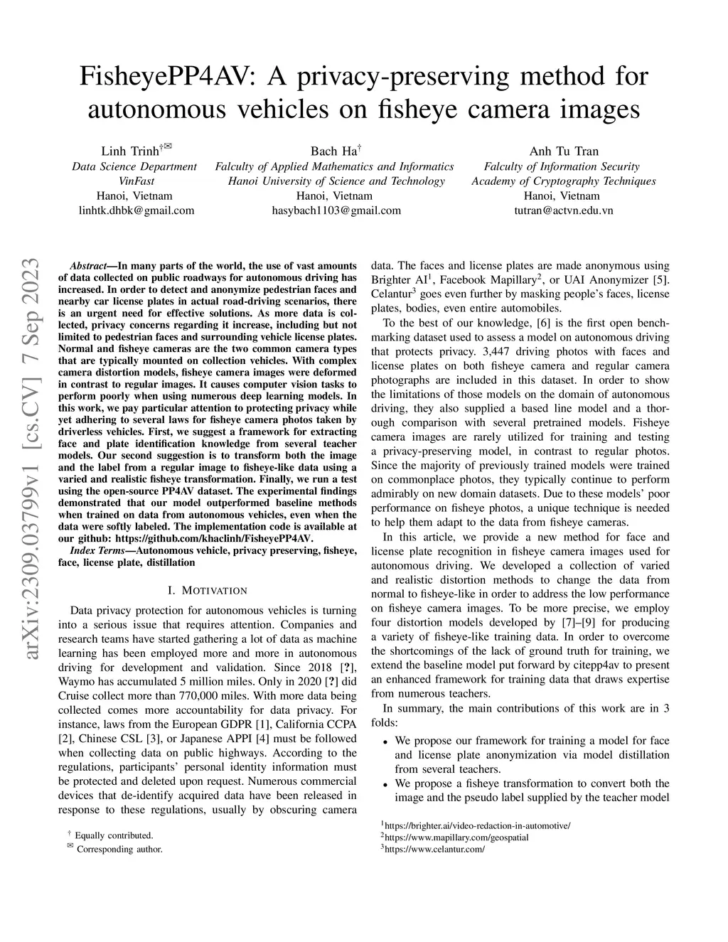 FisheyePP4AV: A privacy-preserving method for autonomous vehicles on