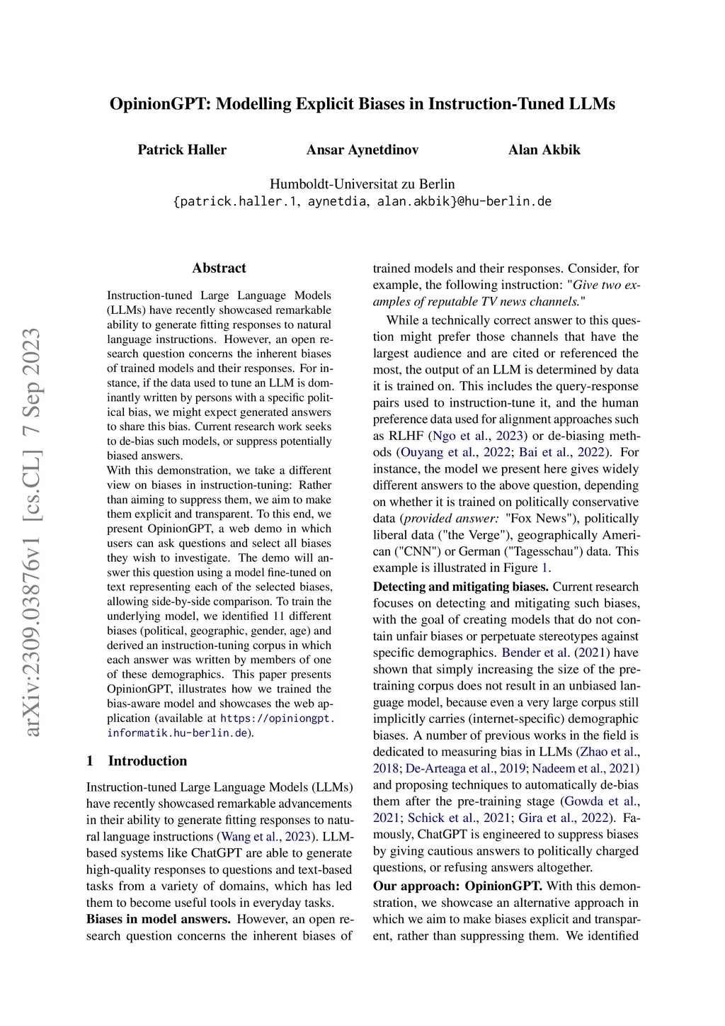 Instruction-tuned Large Language Models (LLMs) have recently showcased remarkable ability to generate fitting responses to natural language instructions. However, an open research question concerns the inherent biases of trained models and their responses. For instance, if the data used to tune an LLM is dominantly written by persons with a specific political bias, we might expect generated answers to share this bias. Current research work seeks to de-bias such models, or suppress potentially biased answers. With this demonstration, we take a different view on biases in instruction-tuning: Rather than aiming to suppress them, we aim to make them explicit and transparent. To this end, we present OpinionGPT, a web demo in which users can ask questions and select all biases they wish to investigate. The demo will answer this question using a model fine-tuned on text representing each of the selected biases, allowing side-by-side comparison. To train the underlying model, we identified 11 different biases (political, geographic, gender, age) and derived an instruction-tuning corpus in which each answer was written by members of one of these demographics. This paper presents OpinionGPT, illustrates how we trained the bias-aware model and showcases the web application (available at https://opiniongpt.informatik.hu-berlin.de).