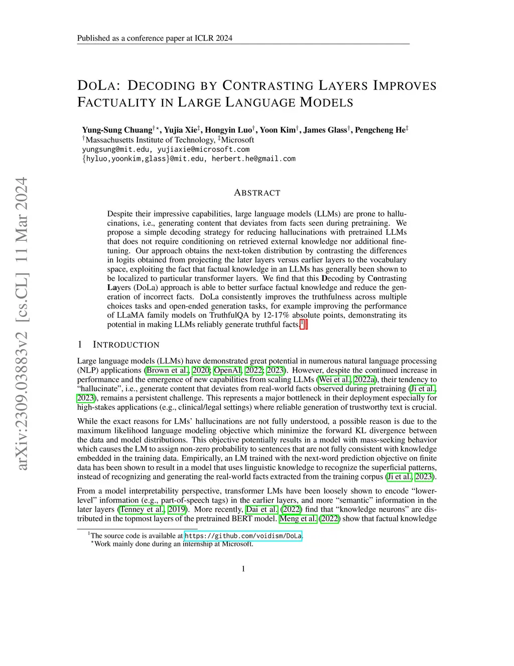 DoLa: Decoding by Contrasting Layers Improves Factuality in Large
