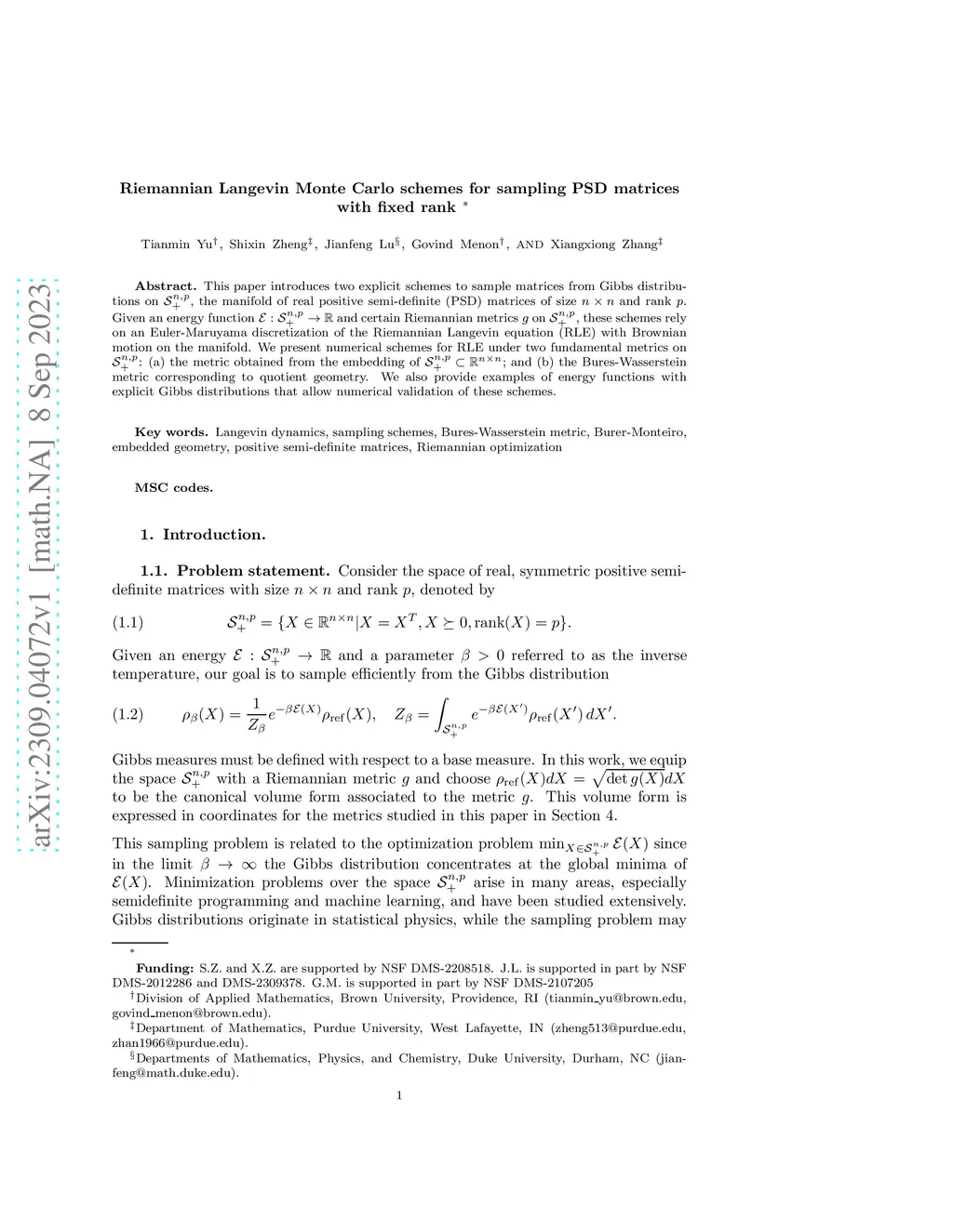 This paper introduces two explicit schemes to sample matrices from Gibbs distributions on , the manifold of real positive semi-definite (PSD) matrices of size and rank . Given an energy function and certain Riemannian metrics on , these schemes rely on an Euler-Maruyama discretization of the Riemannian Langevin equation (RLE) with Brownian motion on the manifold. We present numerical schemes for RLE under two fundamental metrics on : (a) the metric obtained from the embedding of $\mathcal S^{n,p}_+ \subset \mathbb{R}^{n\times n} $; and (b) the Bures-Wasserstein metric corresponding to quotient geometry. We also provide examples of energy functions with explicit Gibbs distributions that allow numerical validation of these schemes.