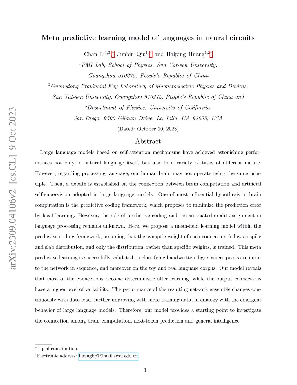 Large language models based on self-attention mechanisms have achieved astonishing performances not only in natural language itself, but also in a variety of tasks of different nature. However, regarding processing language, our human brain may not operate using the same principle. Then, a debate is established on the connection between brain computation and artificial self-supervision adopted in large language models. One of most influential hypothesis in brain computation is the predictive coding framework, which proposes to minimize the prediction error by local learning. However, the role of predictive coding and the associated credit assignment in language processing remains unknown. Here, we propose a mean-field learning model within the predictive coding framework, assuming that the synaptic weight of each connection follows a spike and slab distribution, and only the distribution, rather than specific weights, is trained. This meta predictive learning is successfully validated on classifying handwritten digits where pixels are input to the network in sequence, and moreover on the toy and real language corpus. Our model reveals that most of the connections become deterministic after learning, while the output connections have a higher level of variability. The performance of the resulting network ensemble changes continuously with data load, further improving with more training data, in analogy with the emergent behavior of large language models. Therefore, our model provides a starting point to investigate the connection among brain computation, next-token prediction and general intelligence.