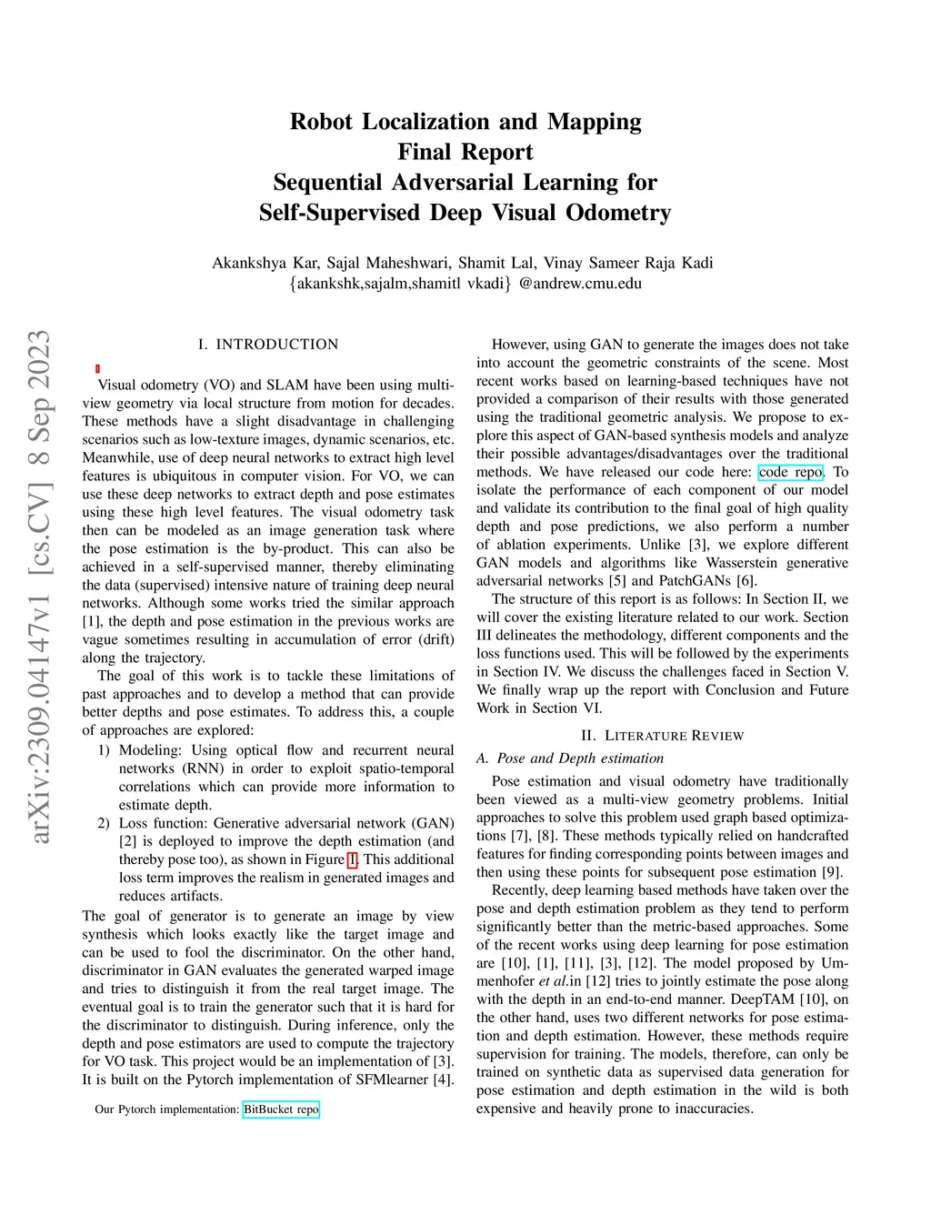 Visual odometry (VO) and SLAM have been using multi-view geometry via local structure from motion for decades. These methods have a slight disadvantage in challenging scenarios such as low-texture images, dynamic scenarios, etc. Meanwhile, use of deep neural networks to extract high level features is ubiquitous in computer vision. For VO, we can use these deep networks to extract depth and pose estimates using these high level features. The visual odometry task then can be modeled as an image generation task where the pose estimation is the by-product. This can also be achieved in a self-supervised manner, thereby eliminating the data (supervised) intensive nature of training deep neural networks. Although some works tried the similar approach [1], the depth and pose estimation in the previous works are vague sometimes resulting in accumulation of error (drift) along the trajectory. The goal of this work is to tackle these limitations of past approaches and to develop a method that can provide better depths and pose estimates. To address this, a couple of approaches are explored: 1) Modeling: Using optical flow and recurrent neural networks (RNN) in order to exploit spatio-temporal correlations which can provide more information to estimate depth. 2) Loss function: Generative adversarial network (GAN) [2] is deployed to improve the depth estimation (and thereby pose too), as shown in Figure 1. This additional loss term improves the realism in generated images and reduces artifacts.