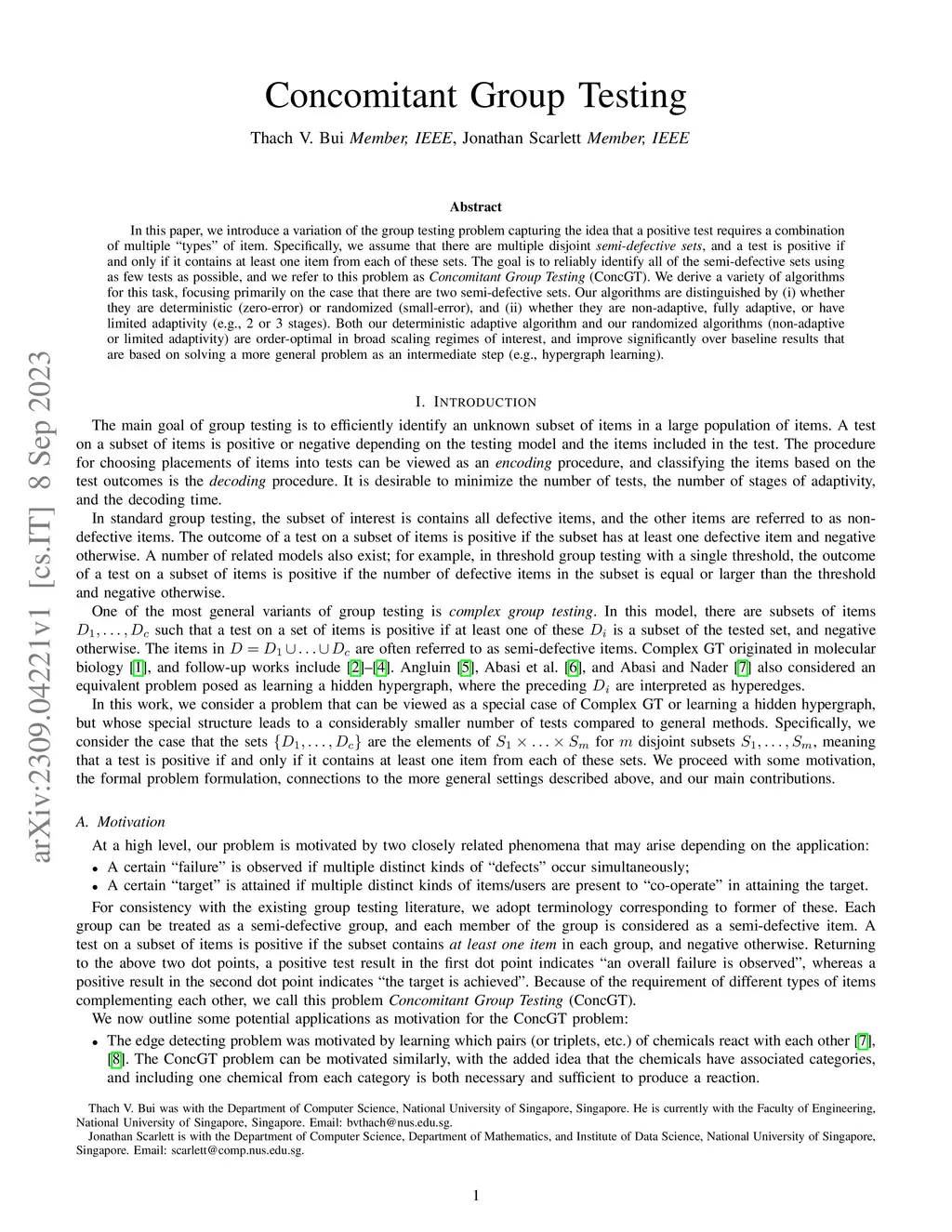 In this paper, we introduce a variation of the group testing problem capturing the idea that a positive test requires a combination of multiple ``types'' of item. Specifically, we assume that there are multiple disjoint \emph{semi-defective sets}, and a test is positive if and only if it contains at least one item from each of these sets. The goal is to reliably identify all of the semi-defective sets using as few tests as possible, and we refer to this problem as \textit{Concomitant Group Testing} (ConcGT). We derive a variety of algorithms for this task, focusing primarily on the case that there are two semi-defective sets. Our algorithms are distinguished by (i) whether they are deterministic (zero-error) or randomized (small-error), and (ii) whether they are non-adaptive, fully adaptive, or have limited adaptivity (e.g., 2 or 3 stages). Both our deterministic adaptive algorithm and our randomized algorithms (non-adaptive or limited adaptivity) are order-optimal in broad scaling regimes of interest, and improve significantly over baseline results that are based on solving a more general problem as an intermediate step (e.g., hypergraph learning).