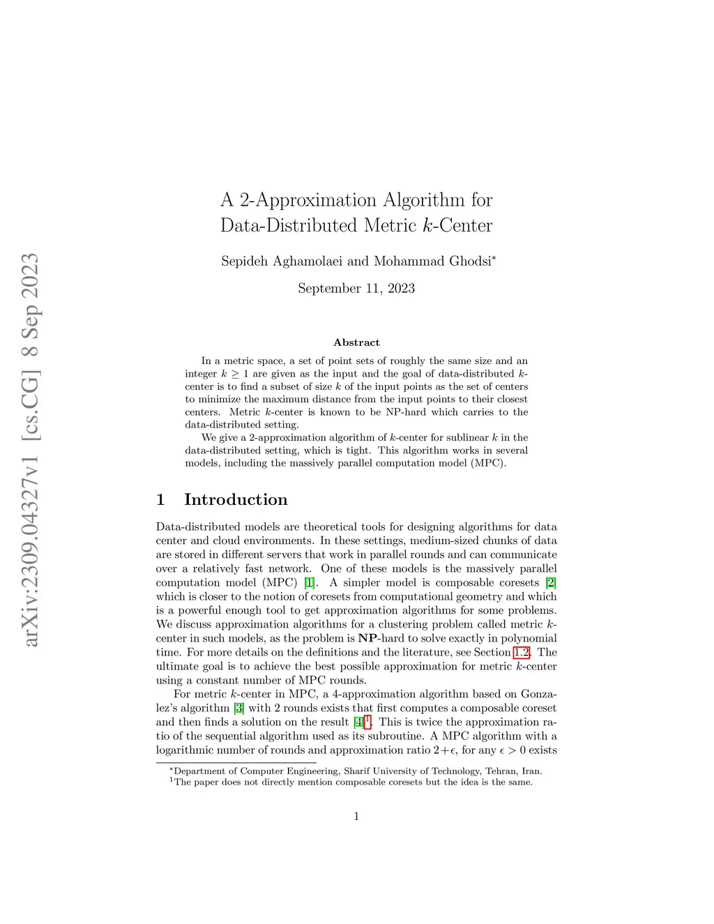 In a metric space, a set of point sets of roughly the same size and an integer are given as the input and the goal of data-distributed -center is to find a subset of size of the input points as the set of centers to minimize the maximum distance from the input points to their closest centers. Metric -center is known to be NP-hard which carries to the data-distributed setting. We give a -approximation algorithm of -center for sublinear in the data-distributed setting, which is tight. This algorithm works in several models, including the massively parallel computation model (MPC).