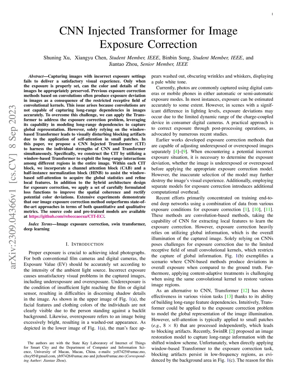 CNN Injected Transformer for Image Exposure Correction