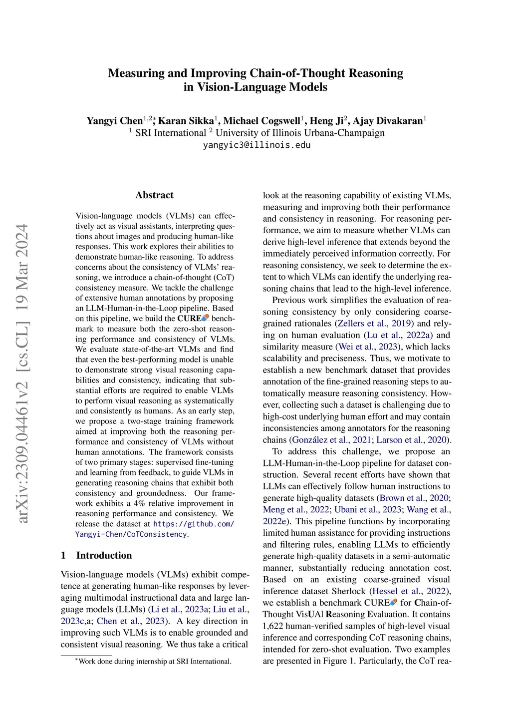 Vision-language models (VLMs) have recently demonstrated strong efficacy as visual assistants that can parse natural queries about the visual content and generate human-like outputs. In this work, we explore the ability of these models to demonstrate human-like reasoning based on the perceived information. To address a crucial concern regarding the extent to which their reasoning capabilities are fully consistent and grounded, we also measure the reasoning consistency of these models. We achieve this by proposing a chain-of-thought (CoT) based consistency measure. However, such an evaluation requires a benchmark that encompasses both high-level inference and detailed reasoning chains, which is costly. We tackle this challenge by proposing a LLM-Human-in-the-Loop pipeline, which notably reduces cost while simultaneously ensuring the generation of a high-quality dataset. Based on this pipeline and the existing coarse-grained annotated dataset, we build the CURE benchmark to measure both the zero-shot reasoning performance and consistency of VLMs. We evaluate existing state-of-the-art VLMs, and find that even the best-performing model is unable to demonstrate strong visual reasoning capabilities and consistency, indicating that substantial efforts are required to enable VLMs to perform visual reasoning as systematically and consistently as humans. As an early step, we propose a two-stage training framework aimed at improving both the reasoning performance and consistency of VLMs. The first stage involves employing supervised fine-tuning of VLMs using step-by-step reasoning samples automatically generated by LLMs. In the second stage, we further augment the training process by incorporating feedback provided by LLMs to produce reasoning chains that are highly consistent and grounded. We empirically highlight the effectiveness of our framework in both reasoning performance and consistency.