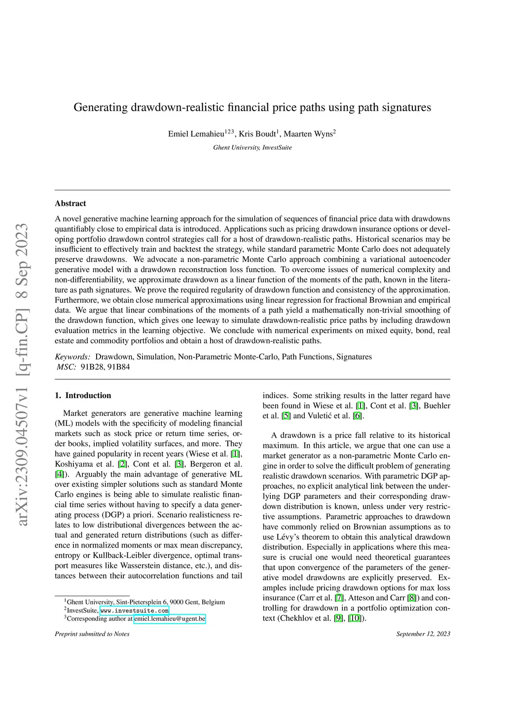 A novel generative machine learning approach for the simulation of sequences of financial price data with drawdowns quantifiably close to empirical data is introduced. Applications such as pricing drawdown insurance options or developing portfolio drawdown control strategies call for a host of drawdown-realistic paths. Historical scenarios may be insufficient to effectively train and backtest the strategy, while standard parametric Monte Carlo does not adequately preserve drawdowns. We advocate a non-parametric Monte Carlo approach combining a variational autoencoder generative model with a drawdown reconstruction loss function. To overcome issues of numerical complexity and non-differentiability, we approximate drawdown as a linear function of the moments of the path, known in the literature as path signatures. We prove the required regularity of drawdown function and consistency of the approximation. Furthermore, we obtain close numerical approximations using linear regression for fractional Brownian and empirical data. We argue that linear combinations of the moments of a path yield a mathematically non-trivial smoothing of the drawdown function, which gives one leeway to simulate drawdown-realistic price paths by including drawdown evaluation metrics in the learning objective. We conclude with numerical experiments on mixed equity, bond, real estate and commodity portfolios and obtain a host of drawdown-realistic paths.