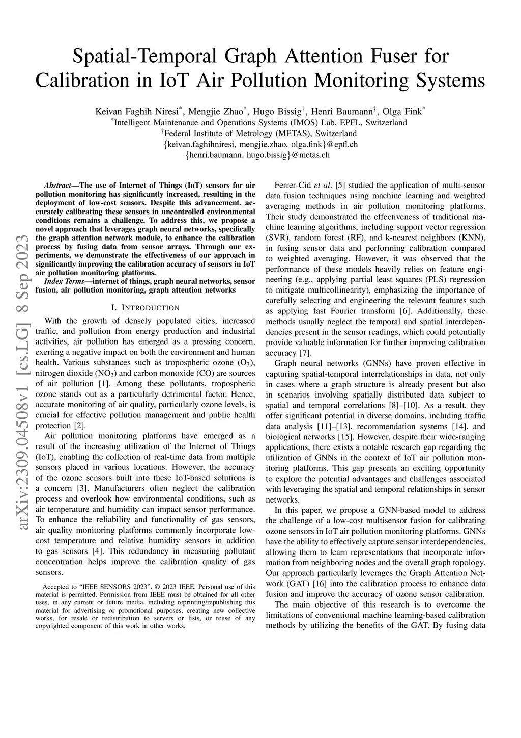 The use of Internet of Things (IoT) sensors for air pollution monitoring has significantly increased, resulting in the deployment of low-cost sensors. Despite this advancement, accurately calibrating these sensors in uncontrolled environmental conditions remains a challenge. To address this, we propose a novel approach that leverages graph neural networks, specifically the graph attention network module, to enhance the calibration process by fusing data from sensor arrays. Through our experiments, we demonstrate the effectiveness of our approach in significantly improving the calibration accuracy of sensors in IoT air pollution monitoring platforms.
