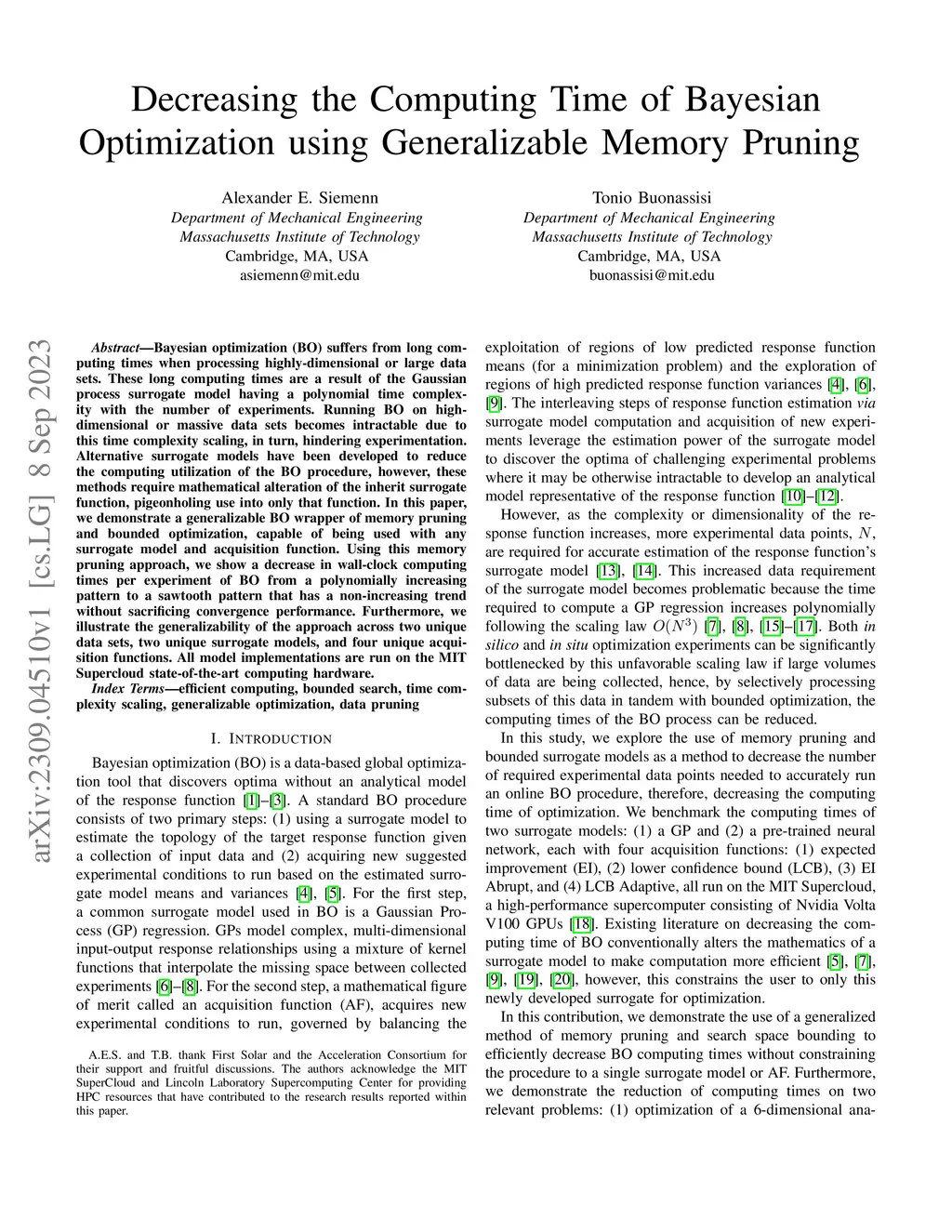 Bayesian optimization (BO) suffers from long computing times when processing highly-dimensional or large data sets. These long computing times are a result of the Gaussian process surrogate model having a polynomial time complexity with the number of experiments. Running BO on high-dimensional or massive data sets becomes intractable due to this time complexity scaling, in turn, hindering experimentation. Alternative surrogate models have been developed to reduce the computing utilization of the BO procedure, however, these methods require mathematical alteration of the inherit surrogate function, pigeonholing use into only that function. In this paper, we demonstrate a generalizable BO wrapper of memory pruning and bounded optimization, capable of being used with any surrogate model and acquisition function. Using this memory pruning approach, we show a decrease in wall-clock computing times per experiment of BO from a polynomially increasing pattern to a sawtooth pattern that has a non-increasing trend without sacrificing convergence performance. Furthermore, we illustrate the generalizability of the approach across two unique data sets, two unique surrogate models, and four unique acquisition functions. All model implementations are run on the MIT Supercloud state-of-the-art computing hardware.