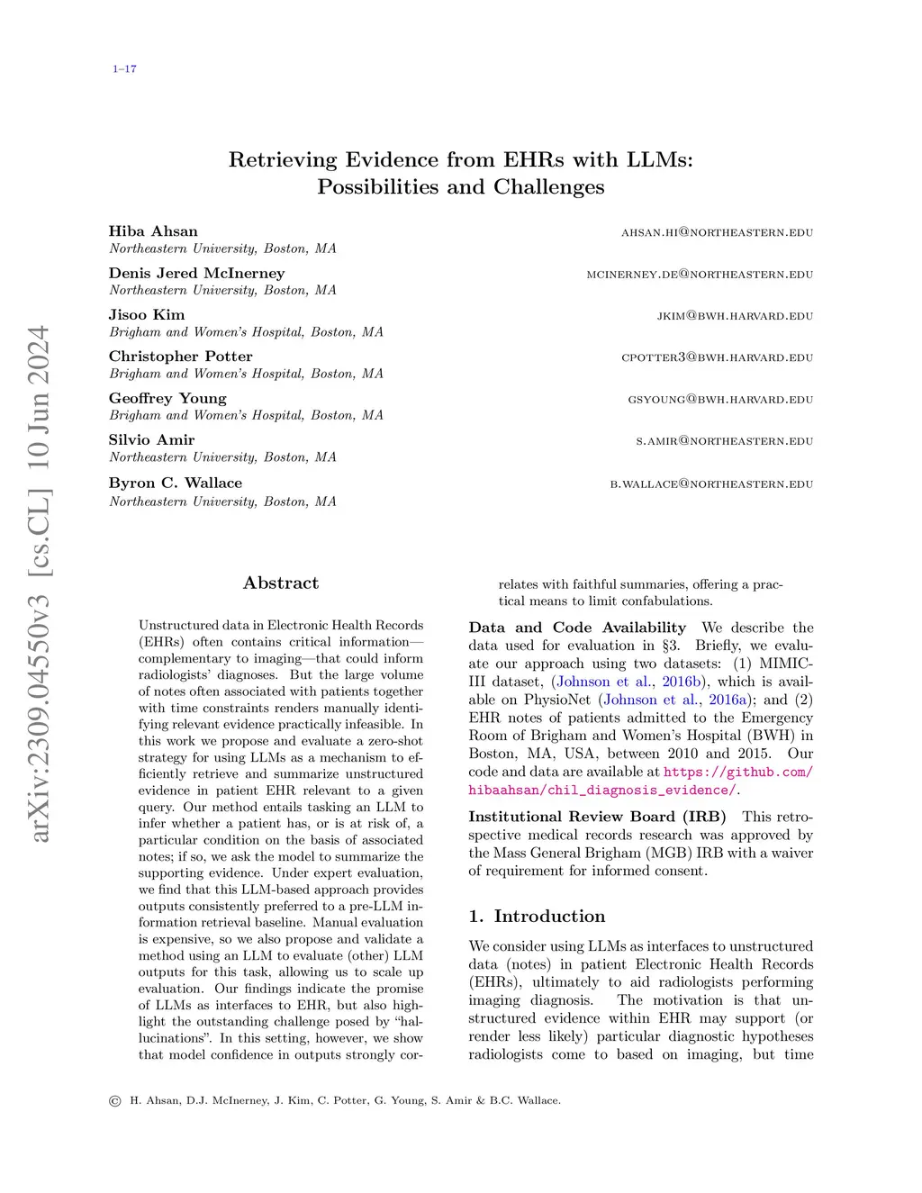 Unstructured data in Electronic Health Records (EHRs) often contains critical information -- complementary to imaging -- that could inform radiologists' diagnoses. But the large volume of notes often associated with patients together with time constraints renders manually identifying relevant evidence practically infeasible. In this work we propose and evaluate a zero-shot strategy for using LLMs as a mechanism to efficiently retrieve and summarize unstructured evidence in patient EHR relevant to a given query. Our method entails tasking an LLM to infer whether a patient has, or is at risk of, a particular condition on the basis of associated notes; if so, we ask the model to summarize the supporting evidence. Under expert evaluation, we find that this LLM-based approach provides outputs consistently preferred to a pre-LLM information retrieval baseline. Manual evaluation is expensive, so we also propose and validate a method using an LLM to evaluate (other) LLM outputs for this task, allowing us to scale up evaluation. Our findings indicate the promise of LLMs as interfaces to EHR, but also highlight the outstanding challenge posed by "hallucinations". In this setting, however, we show that model confidence in outputs strongly correlates with faithful summaries, offering a practical means to limit confabulations.