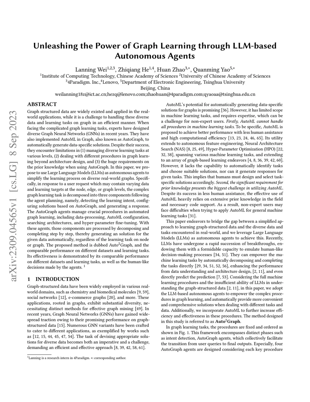 Graph structured data are widely existed and applied in the real-world applications, while it is a challenge to handling these diverse data and learning tasks on graph in an efficient manner. When facing the complicated graph learning tasks, experts have designed diverse Graph Neural Networks (GNNs) in recent years. They have also implemented AutoML in Graph, also known as AutoGraph, to automatically generate data-specific solutions. Despite their success, they encounter limitations in (1) managing diverse learning tasks at various levels, (2) dealing with different procedures in graph learning beyond architecture design, and (3) the huge requirements on the prior knowledge when using AutoGraph. In this paper, we propose to use Large Language Models (LLMs) as autonomous agents to simplify the learning process on diverse real-world graphs. Specifically, in response to a user request which may contain varying data and learning targets at the node, edge, or graph levels, the complex graph learning task is decomposed into three components following the agent planning, namely, detecting the learning intent, configuring solutions based on AutoGraph, and generating a response. The AutoGraph agents manage crucial procedures in automated graph learning, including data-processing, AutoML configuration, searching architectures, and hyper-parameter fine-tuning. With these agents, those components are processed by decomposing and completing step by step, thereby generating a solution for the given data automatically, regardless of the learning task on node or graph. The proposed method is dubbed AutoGraph, and the comparable performance on different datasets and learning tasks. Its effectiveness is demonstrated by its comparable performance on different datasets and learning tasks, as well as the human-like decisions made by the agents.