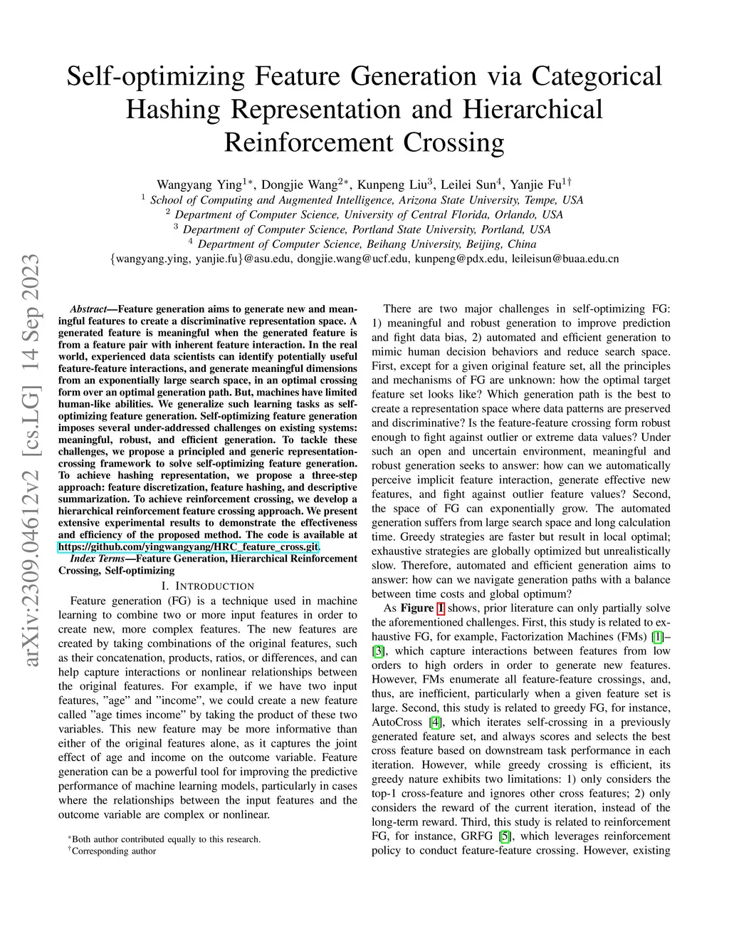 Feature generation aims to generate new and meaningful features to create a discriminative representation space.A generated feature is meaningful when the generated feature is from a feature pair with inherent feature interaction. In the real world, experienced data scientists can identify potentially useful feature-feature interactions, and generate meaningful dimensions from an exponentially large search space, in an optimal crossing form over an optimal generation path. But, machines have limited human-like abilities.We generalize such learning tasks as self-optimizing feature generation. Self-optimizing feature generation imposes several under-addressed challenges on existing systems: meaningful, robust, and efficient generation. To tackle these challenges, we propose a principled and generic representation-crossing framework to solve self-optimizing feature generation.To achieve hashing representation, we propose a three-step approach: feature discretization, feature hashing, and descriptive summarization. To achieve reinforcement crossing, we develop a hierarchical reinforcement feature crossing approach.We present extensive experimental results to demonstrate the effectiveness and efficiency of the proposed method. The code is available at https://github.com/yingwangyang/HRC_feature_cross.git.