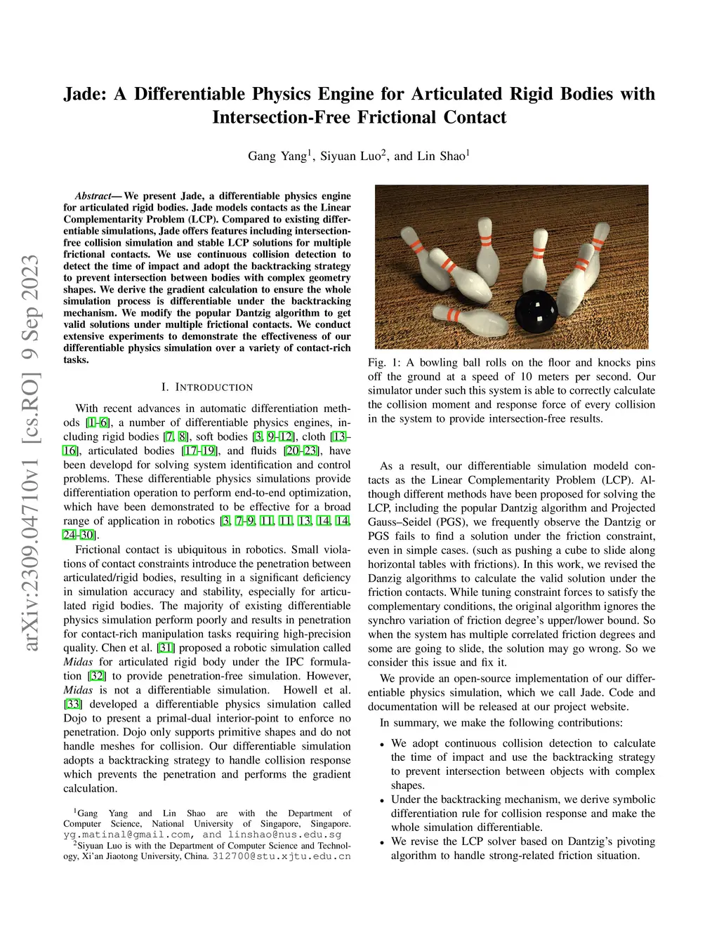We present Jade, a differentiable physics engine for articulated rigid bodies. Jade models contacts as the Linear Complementarity Problem (LCP). Compared to existing differentiable simulations, Jade offers features including intersection-free collision simulation and stable LCP solutions for multiple frictional contacts. We use continuous collision detection to detect the time of impact and adopt the backtracking strategy to prevent intersection between bodies with complex geometry shapes. We derive the gradient calculation to ensure the whole simulation process is differentiable under the backtracking mechanism. We modify the popular Dantzig algorithm to get valid solutions under multiple frictional contacts. We conduct extensive experiments to demonstrate the effectiveness of our differentiable physics simulation over a variety of contact-rich tasks.