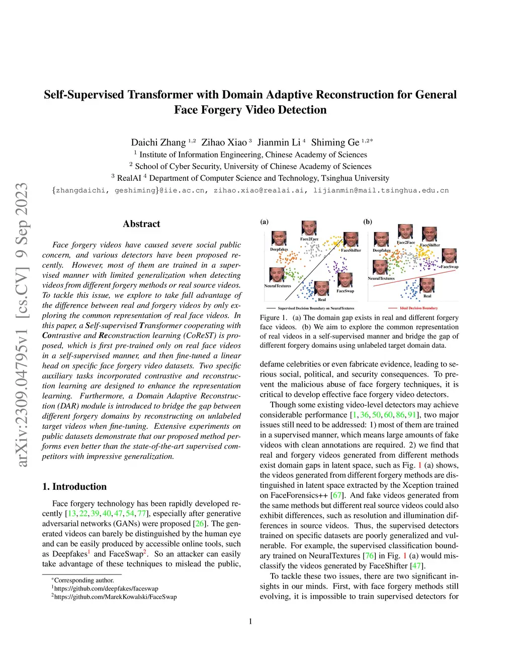Face forgery videos have caused severe social public concern, and various detectors have been proposed recently. However, most of them are trained in a supervised manner with limited generalization when detecting videos from different forgery methods or real source videos. To tackle this issue, we explore to take full advantage of the difference between real and forgery videos by only exploring the common representation of real face videos. In this paper, a Self-supervised Transformer cooperating with Contrastive and Reconstruction learning (CoReST) is proposed, which is first pre-trained only on real face videos in a self-supervised manner, and then fine-tuned a linear head on specific face forgery video datasets. Two specific auxiliary tasks incorporated contrastive and reconstruction learning are designed to enhance the representation learning. Furthermore, a Domain Adaptive Reconstruction (DAR) module is introduced to bridge the gap between different forgery domains by reconstructing on unlabeled target videos when fine-tuning. Extensive experiments on public datasets demonstrate that our proposed method performs even better than the state-of-the-art supervised competitors with impressive generalization.