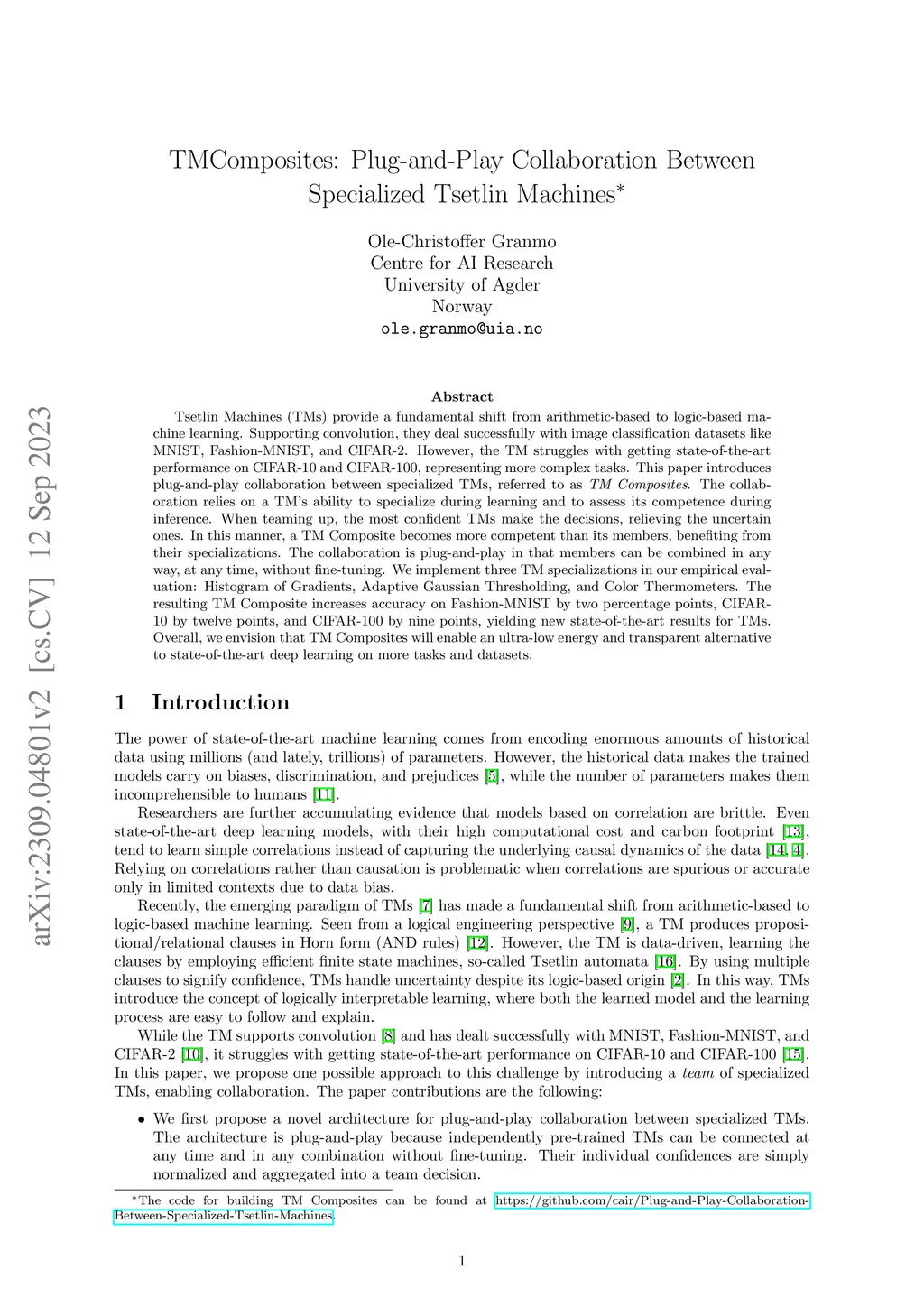 Tsetlin Machines (TMs) provide a fundamental shift from arithmetic-based to logic-based machine learning. Supporting convolution, they deal successfully with image classification datasets like MNIST, Fashion-MNIST, and CIFAR-2. However, the TM struggles with getting state-of-the-art performance on CIFAR-10 and CIFAR-100, representing more complex tasks. This paper introduces plug-and-play collaboration between specialized TMs, referred to as TM Composites. The collaboration relies on a TM's ability to specialize during learning and to assess its competence during inference. When teaming up, the most confident TMs make the decisions, relieving the uncertain ones. In this manner, a TM Composite becomes more competent than its members, benefiting from their specializations. The collaboration is plug-and-play in that members can be combined in any way, at any time, without fine-tuning. We implement three TM specializations in our empirical evaluation: Histogram of Gradients, Adaptive Gaussian Thresholding, and Color Thermometers. The resulting TM Composite increases accuracy on Fashion-MNIST by two percentage points, CIFAR-10 by twelve points, and CIFAR-100 by nine points, yielding new state-of-the-art results for TMs. Overall, we envision that TM Composites will enable an ultra-low energy and transparent alternative to state-of-the-art deep learning on more tasks and datasets.