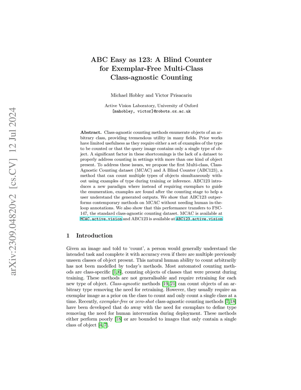 Class-agnostic counting methods enumerate objects of an arbitrary class, providing tremendous utility in many fields. Prior works have limited usefulness as they require either a set of examples of the type to be counted or that the query image contains only a single type of object. A significant factor in these shortcomings is the lack of a dataset to properly address counting in settings with more than one kind of object present. To address these issues, we propose the first Multi-class, Class-Agnostic Counting dataset (MCAC) and A Blind Counter (ABC123), a method that can count multiple types of objects simultaneously without using examples of type during training or inference. ABC123 introduces a new paradigm where instead of requiring exemplars to guide the enumeration, examples are found after the counting stage to help a user understand the generated outputs. We show that ABC123 outperforms contemporary methods on MCAC without needing human in-the-loop annotations. We also show that this performance transfers to FSC-147, the standard class-agnostic counting dataset. MCAC is available at MCAC.active.vision and ABC123 is available at ABC123.active.vision.