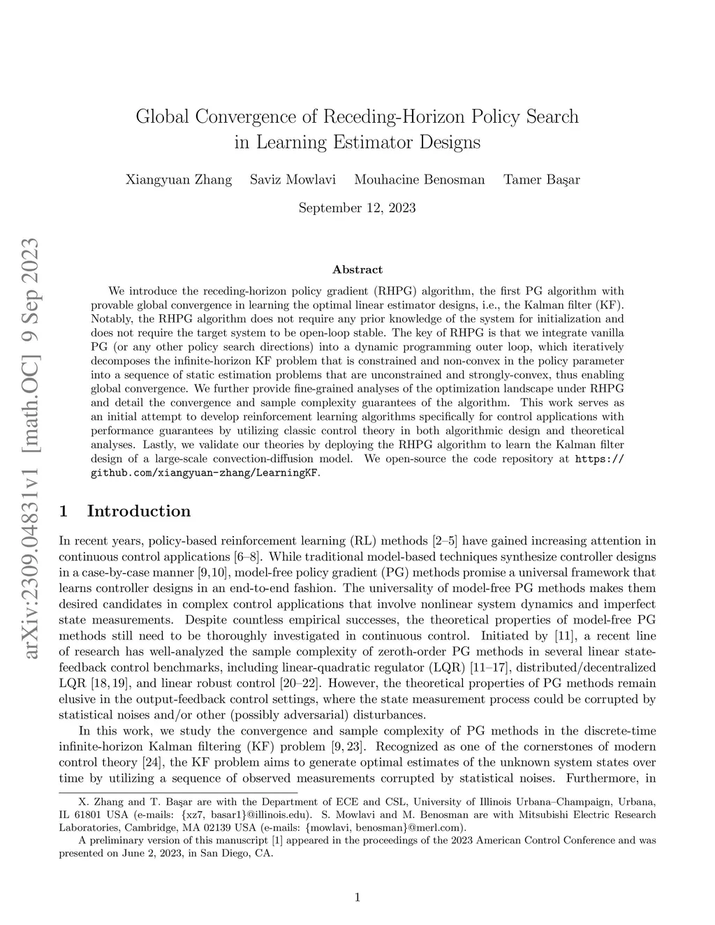 We introduce the receding-horizon policy gradient (RHPG) algorithm, the first PG algorithm with provable global convergence in learning the optimal linear estimator designs, i.e., the Kalman filter (KF). Notably, the RHPG algorithm does not require any prior knowledge of the system for initialization and does not require the target system to be open-loop stable. The key of RHPG is that we integrate vanilla PG (or any other policy search directions) into a dynamic programming outer loop, which iteratively decomposes the infinite-horizon KF problem that is constrained and non-convex in the policy parameter into a sequence of static estimation problems that are unconstrained and strongly-convex, thus enabling global convergence. We further provide fine-grained analyses of the optimization landscape under RHPG and detail the convergence and sample complexity guarantees of the algorithm. This work serves as an initial attempt to develop reinforcement learning algorithms specifically for control applications with performance guarantees by utilizing classic control theory in both algorithmic design and theoretical analyses. Lastly, we validate our theories by deploying the RHPG algorithm to learn the Kalman filter design of a large-scale convection-diffusion model. We open-source the code repository at \url{https://github.com/xiangyuan-zhang/LearningKF}.