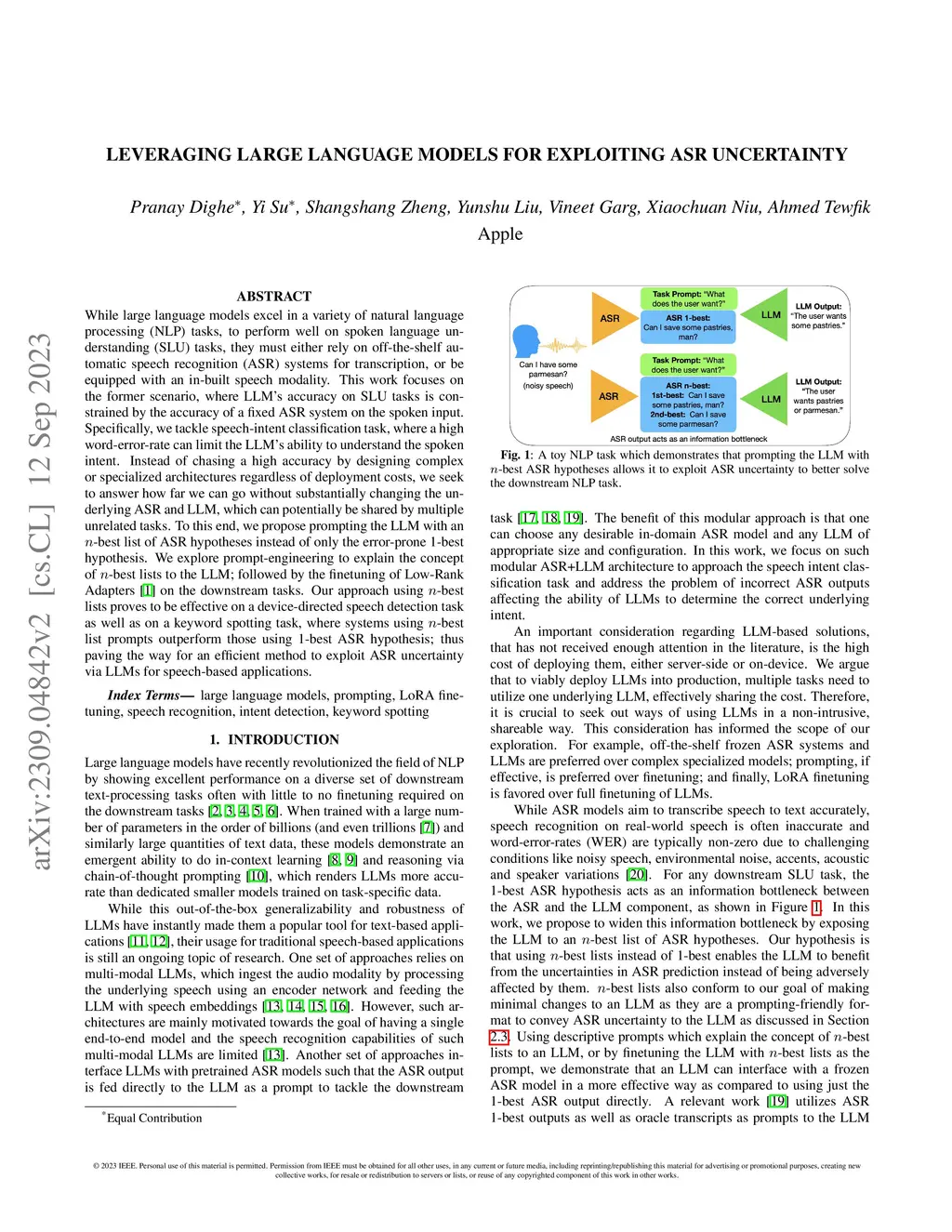 While large language models excel in a variety of natural language processing (NLP) tasks, to perform well on spoken language understanding (SLU) tasks, they must either rely on off-the-shelf automatic speech recognition (ASR) systems for transcription, or be equipped with an in-built speech modality. This work focuses on the former scenario, where LLM's accuracy on SLU tasks is constrained by the accuracy of a fixed ASR system on the spoken input. Specifically, we tackle speech-intent classification task, where a high word-error-rate can limit the LLM's ability to understand the spoken intent. Instead of chasing a high accuracy by designing complex or specialized architectures regardless of deployment costs, we seek to answer how far we can go without substantially changing the underlying ASR and LLM, which can potentially be shared by multiple unrelated tasks. To this end, we propose prompting the LLM with an n-best list of ASR hypotheses instead of only the error-prone 1-best hypothesis. We explore prompt-engineering to explain the concept of n-best lists to the LLM; followed by the finetuning of Low-Rank Adapters on the downstream tasks. Our approach using n-best lists proves to be effective on a device-directed speech detection task as well as on a keyword spotting task, where systems using n-best list prompts outperform those using 1-best ASR hypothesis; thus paving the way for an efficient method to exploit ASR uncertainty via LLMs for speech-based applications.