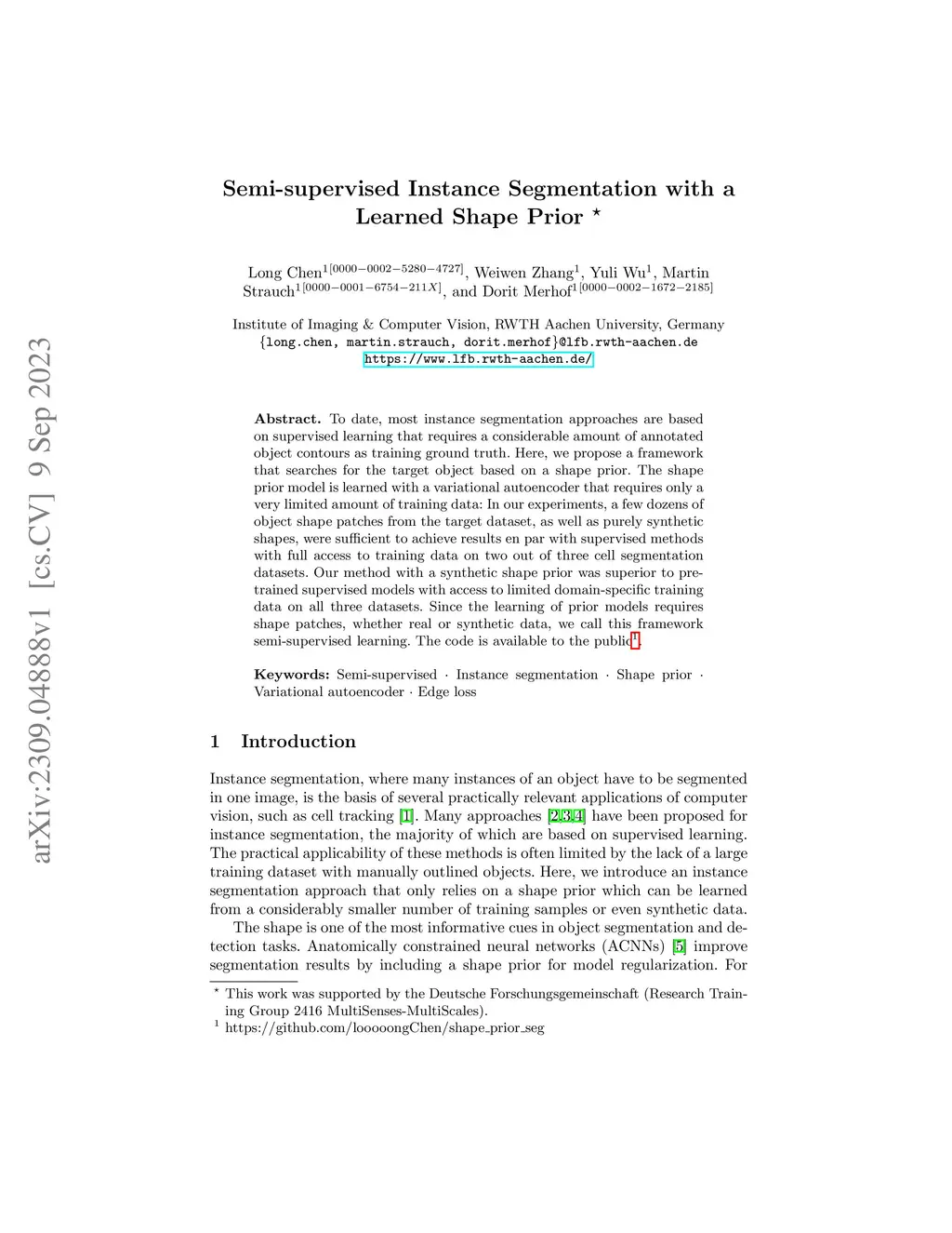 To date, most instance segmentation approaches are based on supervised learning that requires a considerable amount of annotated object contours as training ground truth. Here, we propose a framework that searches for the target object based on a shape prior. The shape prior model is learned with a variational autoencoder that requires only a very limited amount of training data: In our experiments, a few dozens of object shape patches from the target dataset, as well as purely synthetic shapes, were sufficient to achieve results en par with supervised methods with full access to training data on two out of three cell segmentation datasets. Our method with a synthetic shape prior was superior to pre-trained supervised models with access to limited domain-specific training data on all three datasets. Since the learning of prior models requires shape patches, whether real or synthetic data, we call this framework semi-supervised learning.