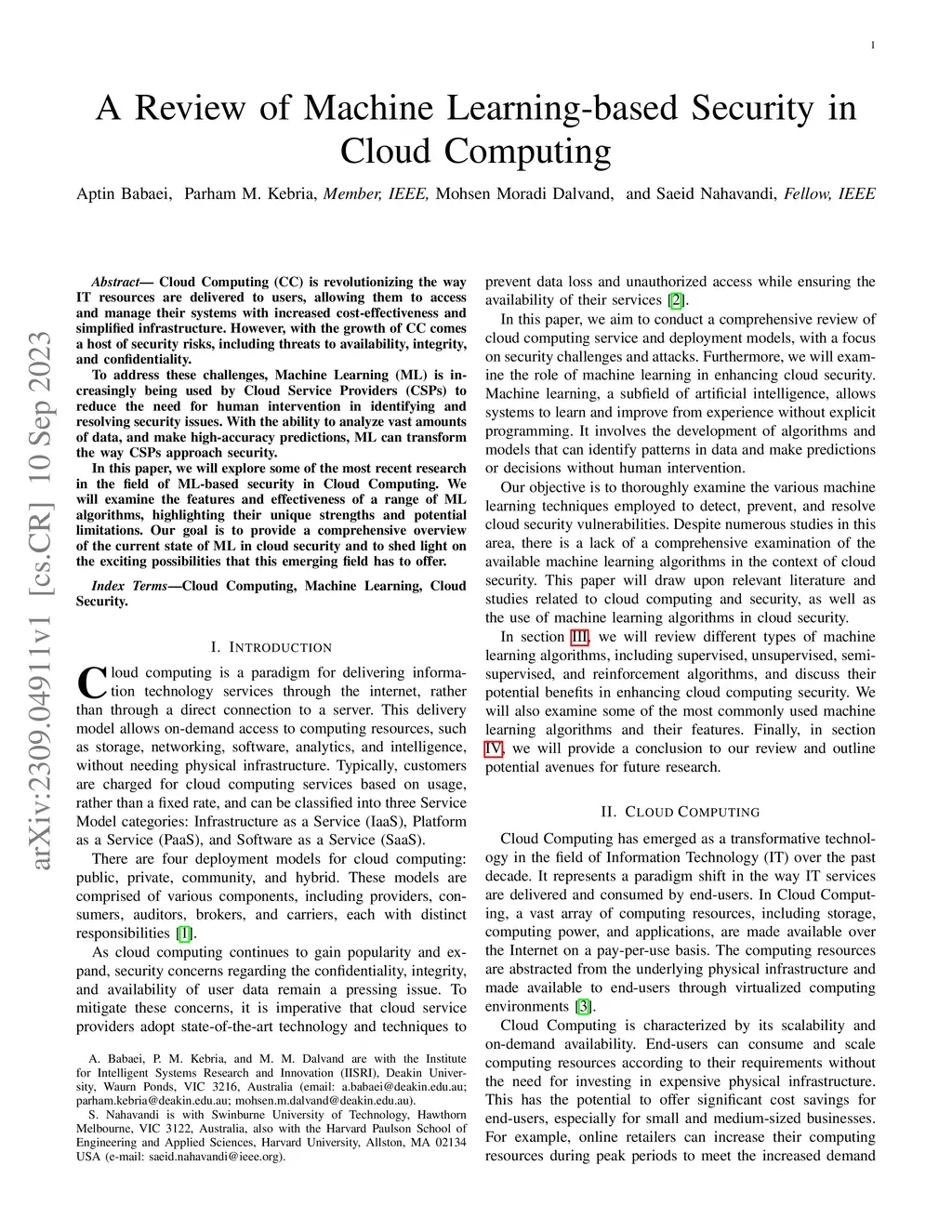 Cloud Computing (CC) is revolutionizing the way IT resources are delivered to users, allowing them to access and manage their systems with increased cost-effectiveness and simplified infrastructure. However, with the growth of CC comes a host of security risks, including threats to availability, integrity, and confidentiality. To address these challenges, Machine Learning (ML) is increasingly being used by Cloud Service Providers (CSPs) to reduce the need for human intervention in identifying and resolving security issues. With the ability to analyze vast amounts of data, and make high-accuracy predictions, ML can transform the way CSPs approach security. In this paper, we will explore some of the most recent research in the field of ML-based security in Cloud Computing. We will examine the features and effectiveness of a range of ML algorithms, highlighting their unique strengths and potential limitations. Our goal is to provide a comprehensive overview of the current state of ML in cloud security and to shed light on the exciting possibilities that this emerging field has to offer.
