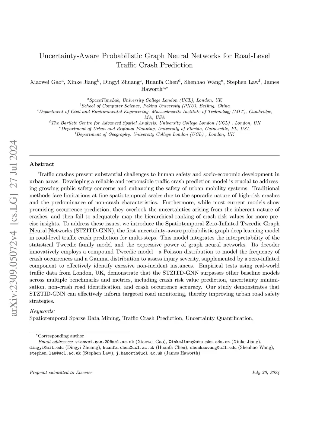 Traffic accidents present substantial challenges to human safety and socioeconomic development in urban areas. Developing a reliable and responsible traffic accident prediction model is crucial to addressing growing public safety concerns and enhancing the safety of urban mobility systems. Traditional methods face limitations at fine spatiotemporal scales due to the sporadic nature of highrisk accidents and the predominance of nonaccident characteristics. Furthermore, while most current models show promising occurrence prediction, they overlook the uncertainties arising from the inherent nature of accidents, and then fail to adequately map the hierarchical ranking of accident risk values for more precise insights. To address these issues, we introduce the Spatiotemporal ZeroInflated Tweedie Graph Neural Network ,STZITDGNN, the first uncertainty-aware probabilistic graph deep learning model in roadlevel traffic accident prediction for multi-steps. This model integrates the interpretability of the statistical Tweedie family model and the expressive power of graph neural networks. Its decoder innovatively employs a compound Tweedie model, a Poisson distribution to model the frequency of accident occurrences and a Gamma distribution to assess injury severity, supplemented by a zeroinflated component to effectively identify exessive non-incident instances. Empirical tests using realworld traffic data from London, UK, demonstrate that the STZITDGNN surpasses other baseline models across multiple benchmarks and metrics, including accident risk value prediction, uncertainty minimisation, nonaccident road identification and accident occurrence accuracy. Our study demonstrates that STZTIDGNN can effectively inform targeted road monitoring, thereby improving urban road safety strategies.