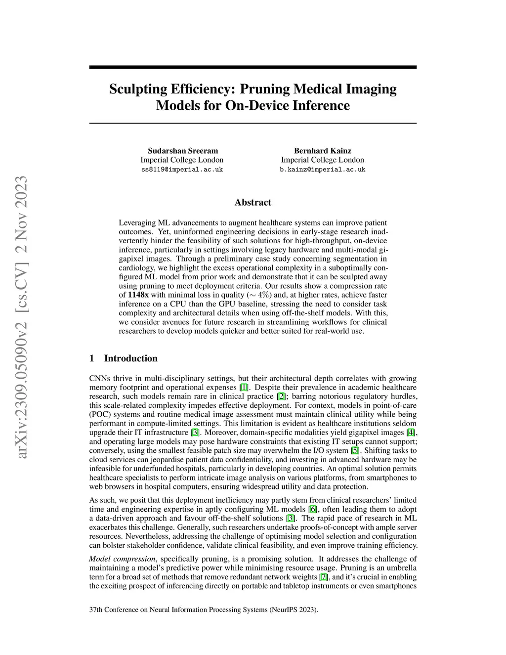 Leveraging ML advancements to augment healthcare systems can improve patient outcomes. Yet, uninformed engineering decisions in early-stage research inadvertently hinder the feasibility of such solutions for high-throughput, on-device inference, particularly in settings involving legacy hardware and multi-modal gigapixel images. Through a preliminary case study concerning segmentation in cardiology, we highlight the excess operational complexity in a suboptimally configured ML model from prior work and demonstrate that it can be sculpted away using pruning to meet deployment criteria. Our results show a compression rate of 1148x with minimal loss in quality (~4%) and, at higher rates, achieve faster inference on a CPU than the GPU baseline, stressing the need to consider task complexity and architectural details when using off-the-shelf models. With this, we consider avenues for future research in streamlining workflows for clinical researchers to develop models quicker and better suited for real-world use.